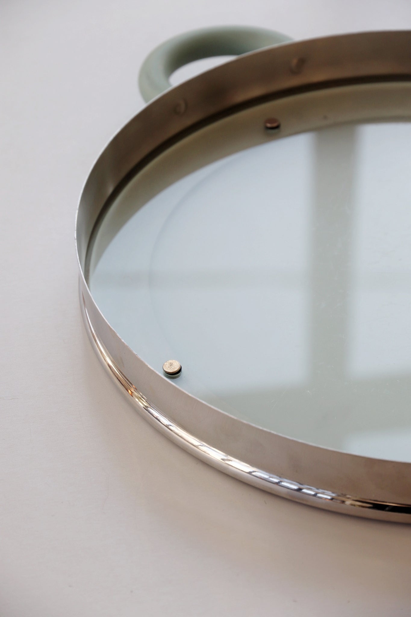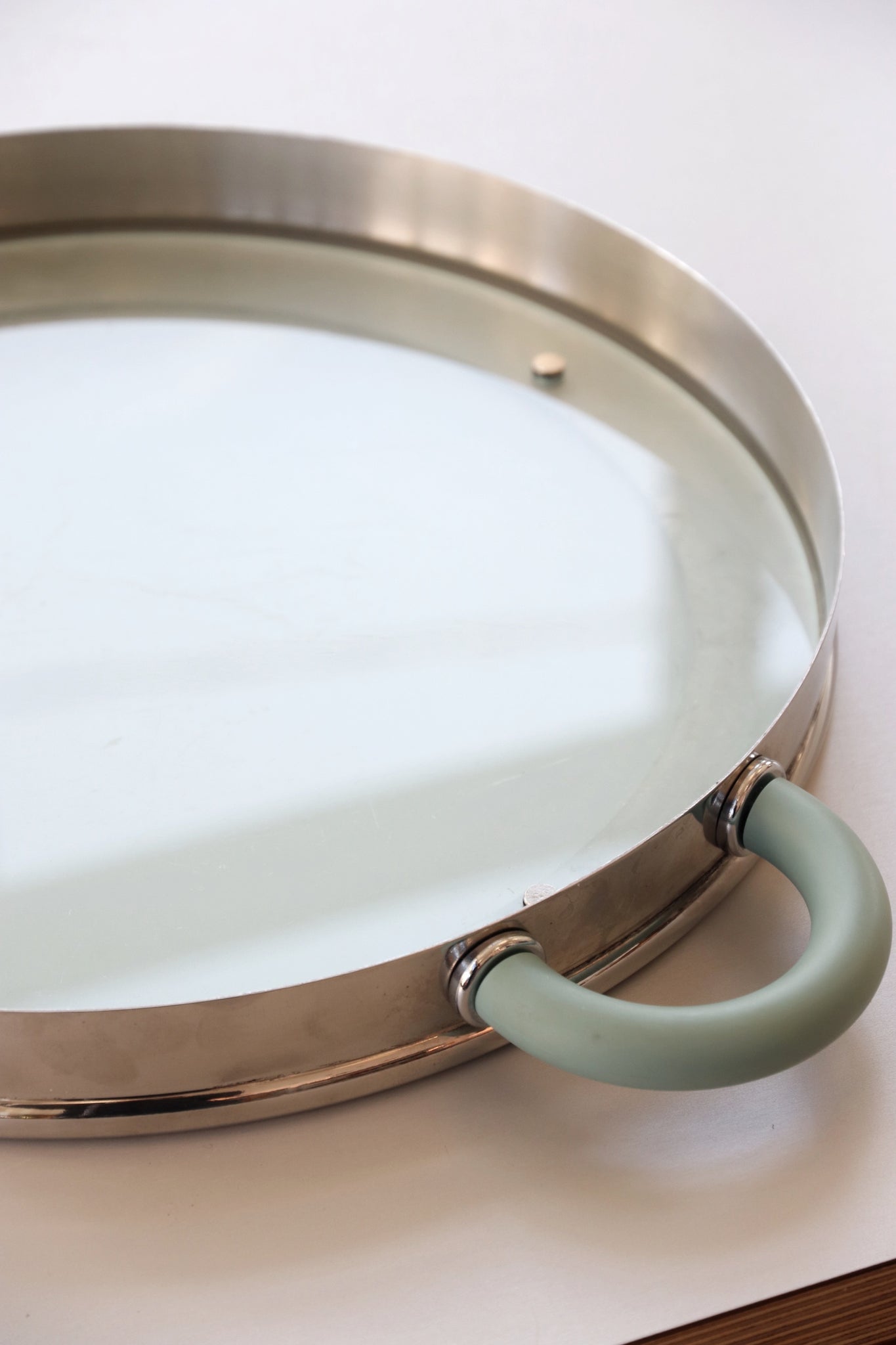 2000's Post modern tray designed by Michael Graves. Tray features a stainless steel frame with frosted glass and chunky rounded rubber handles. In good vintage condition with age appropriate wear such as scratches, scuffs, and patina throughout.