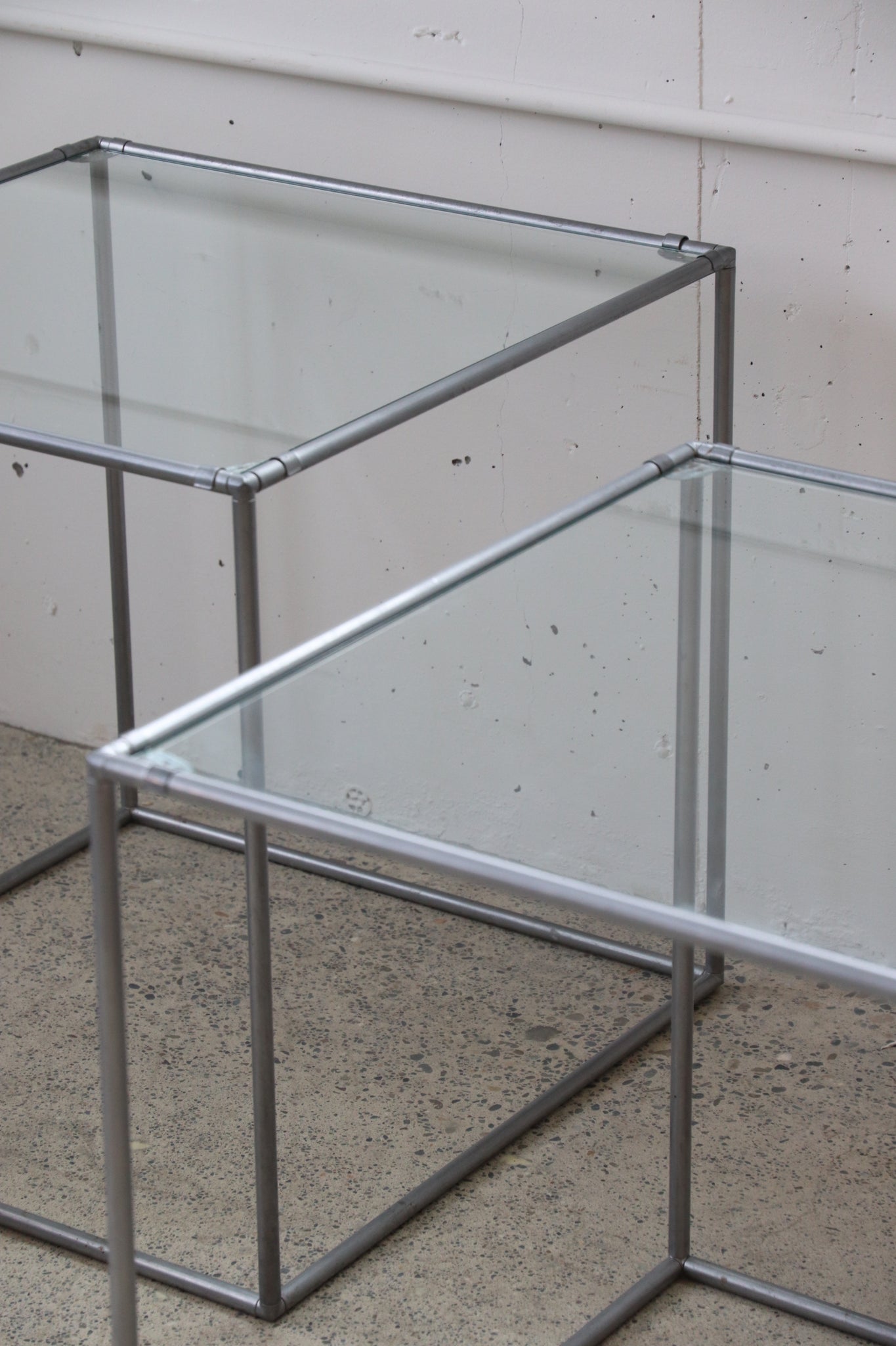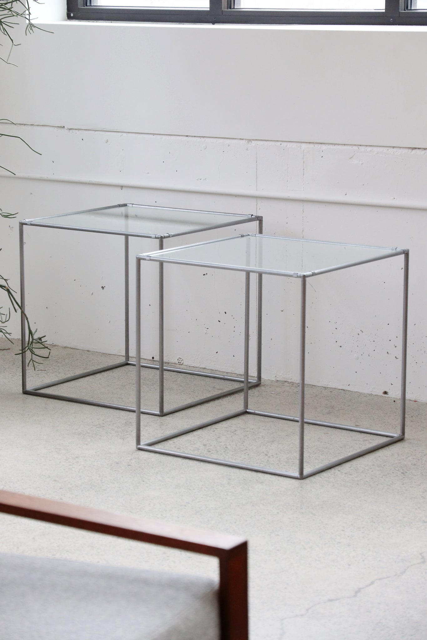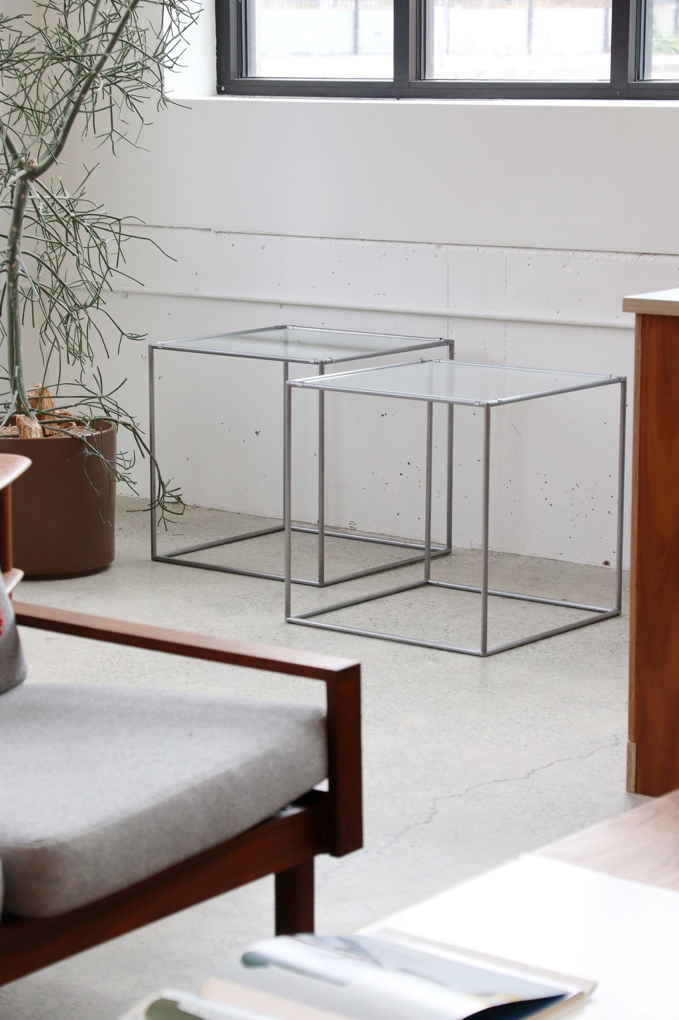 Abstracta cube side table designed by Poul Cadovious. Frame is powder coated in a light grey and paired with a glass top. In good vintage condition and shows age appropriate wear throughout such as scuffs, scratches, and patina throughout with very light scratches and minor chips on the edges of the glass. If you'd like additional details or photos you can email us to inquire. No manufacturing markings present.