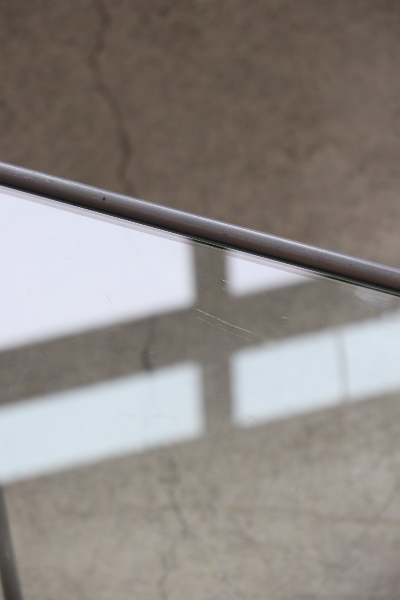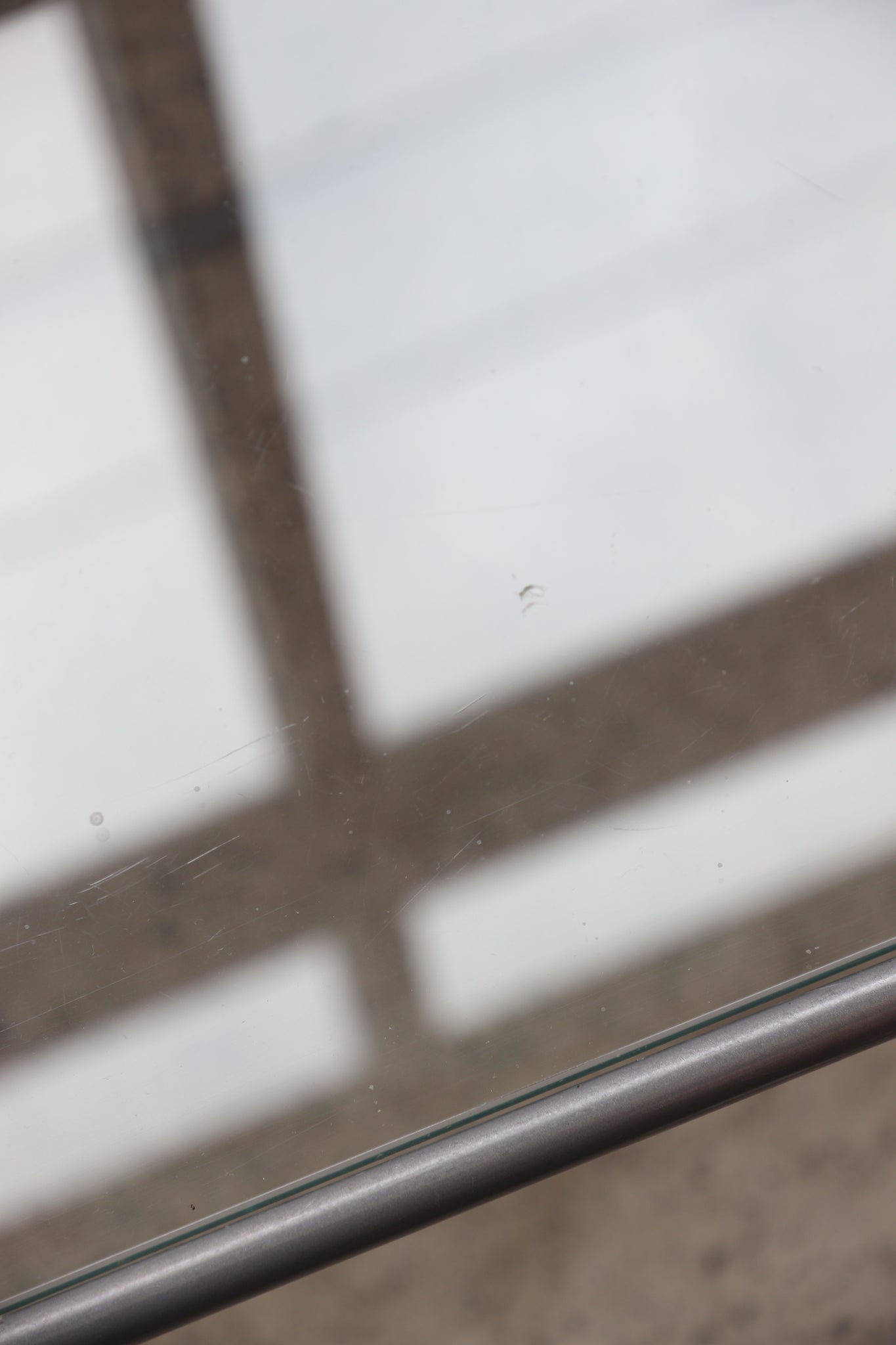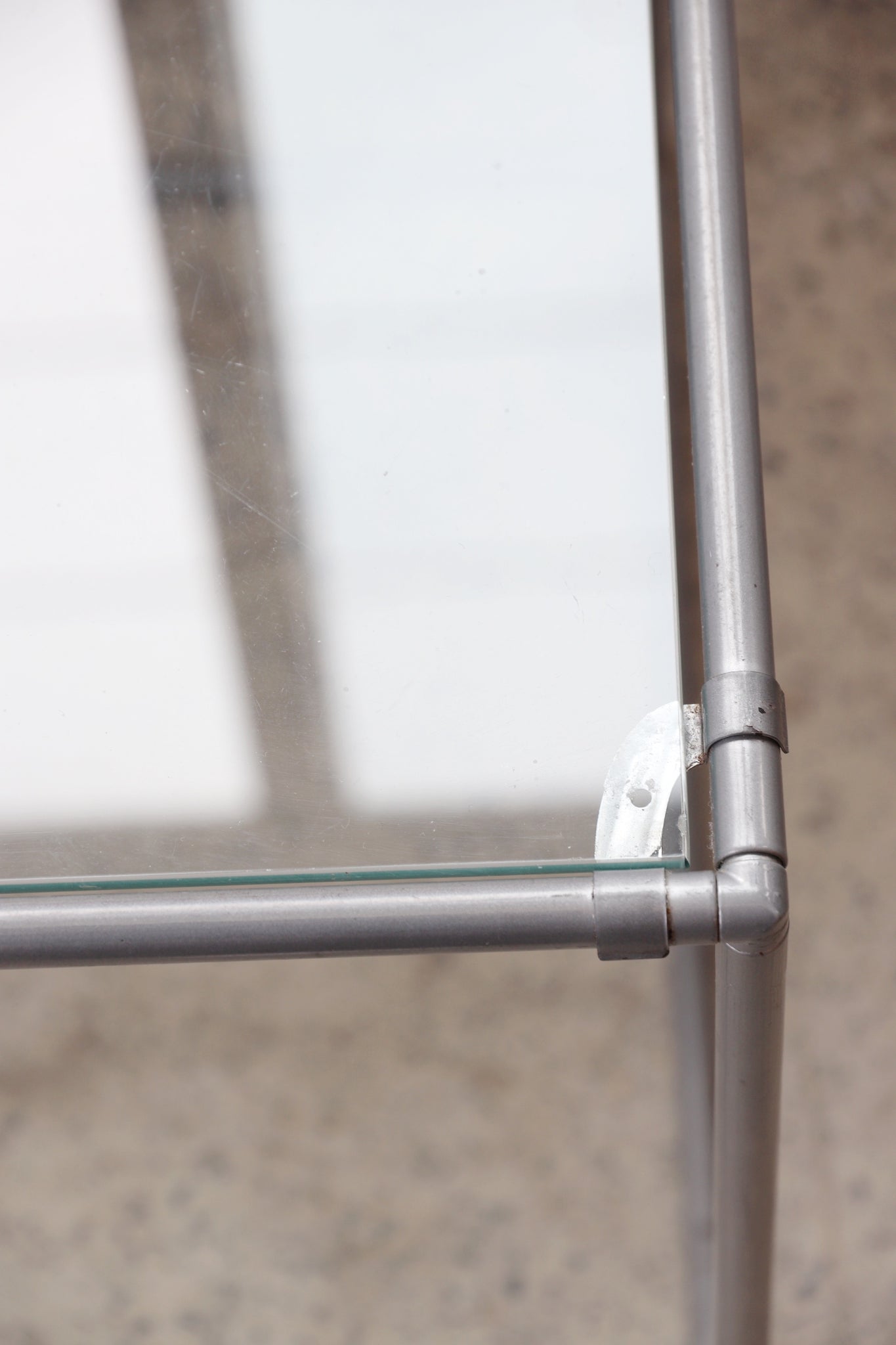 Abstracta cube side table designed by Poul Cadovious. Frame is powder coated in a light grey and paired with a glass top. In good vintage condition and shows age appropriate wear throughout such as scuffs, scratches, and patina throughout with very light scratches and minor chips on the edges of the glass. If you'd like additional details or photos you can email us to inquire. No manufacturing markings present.