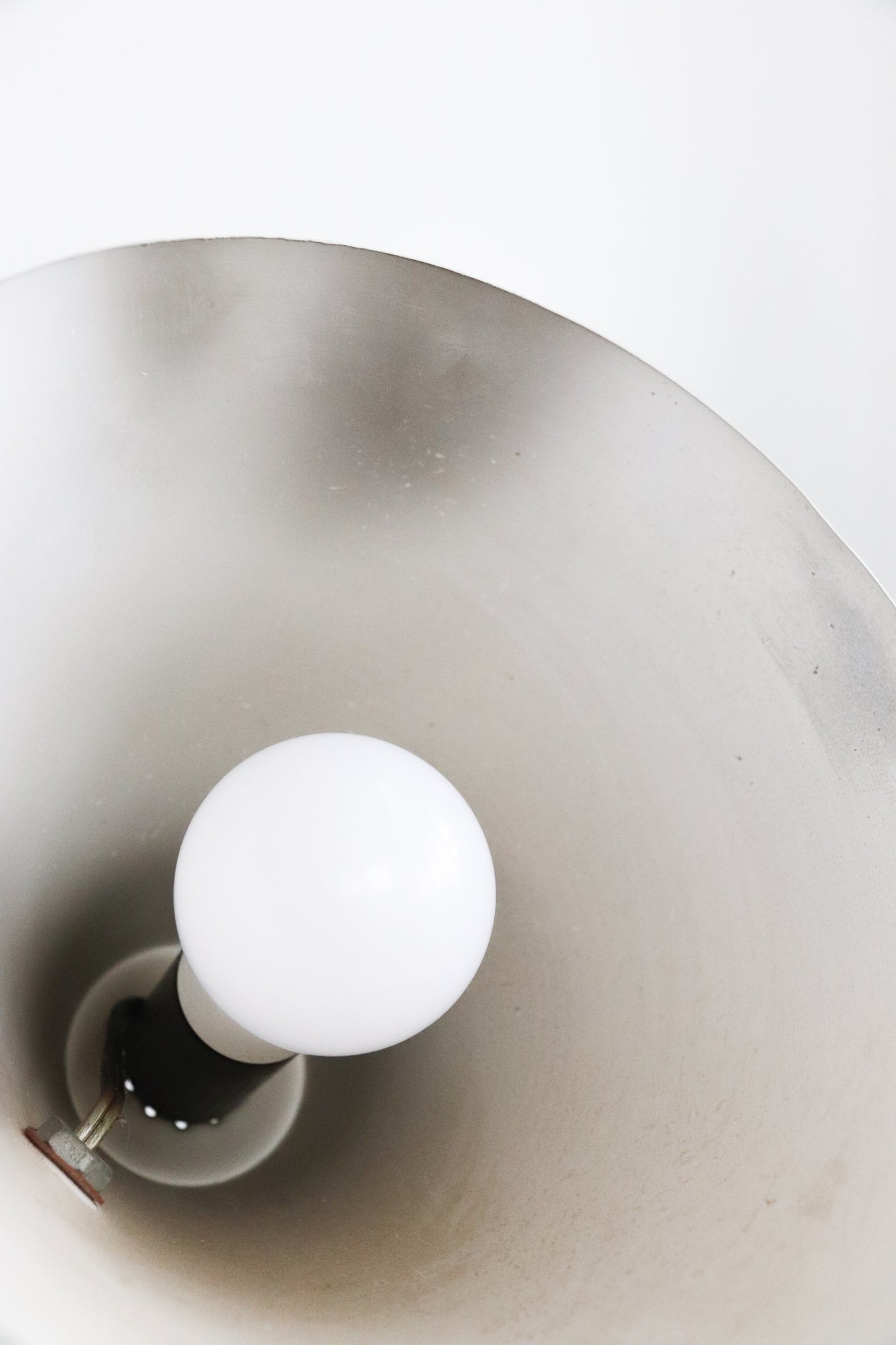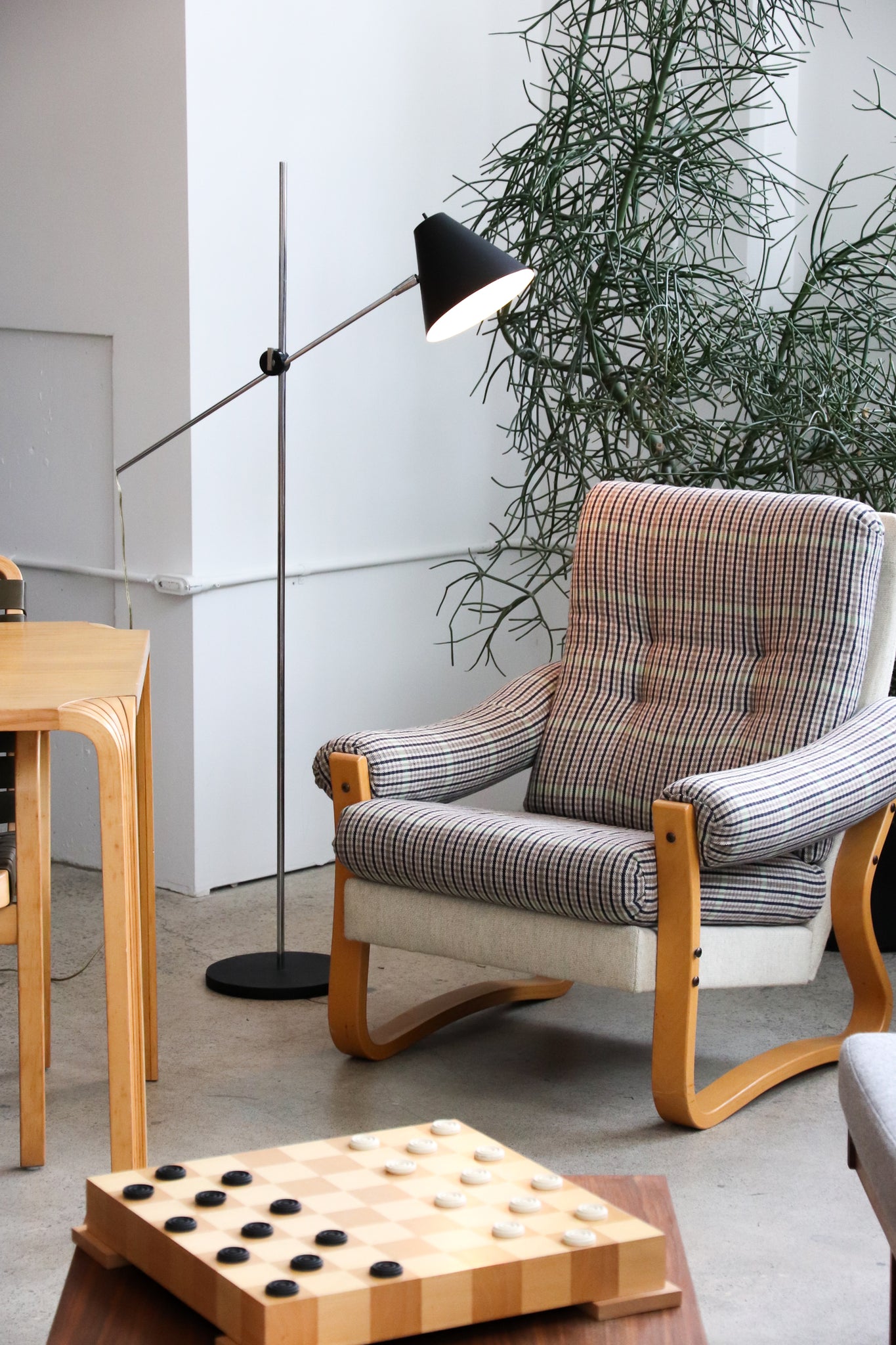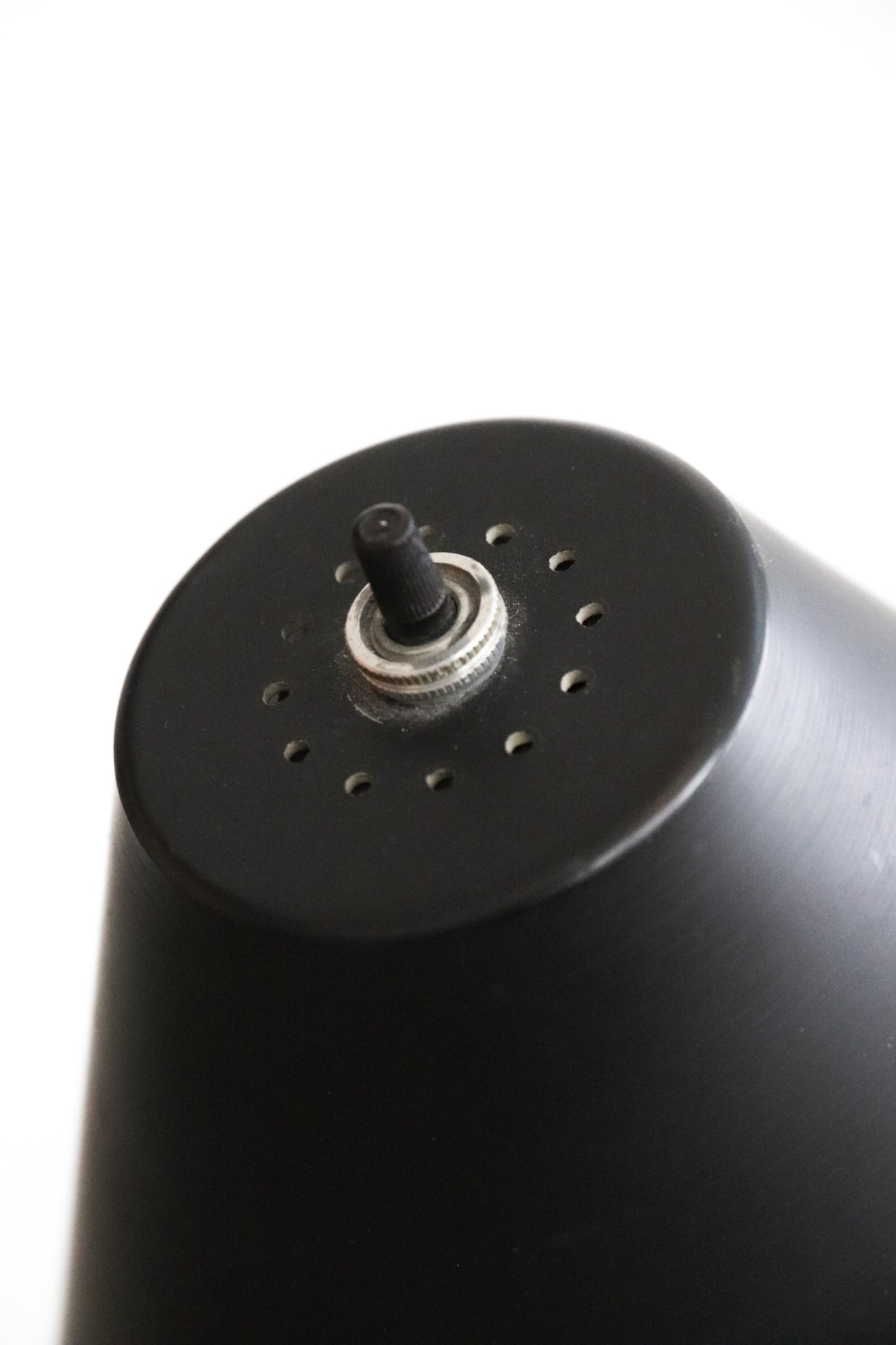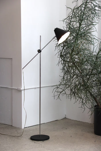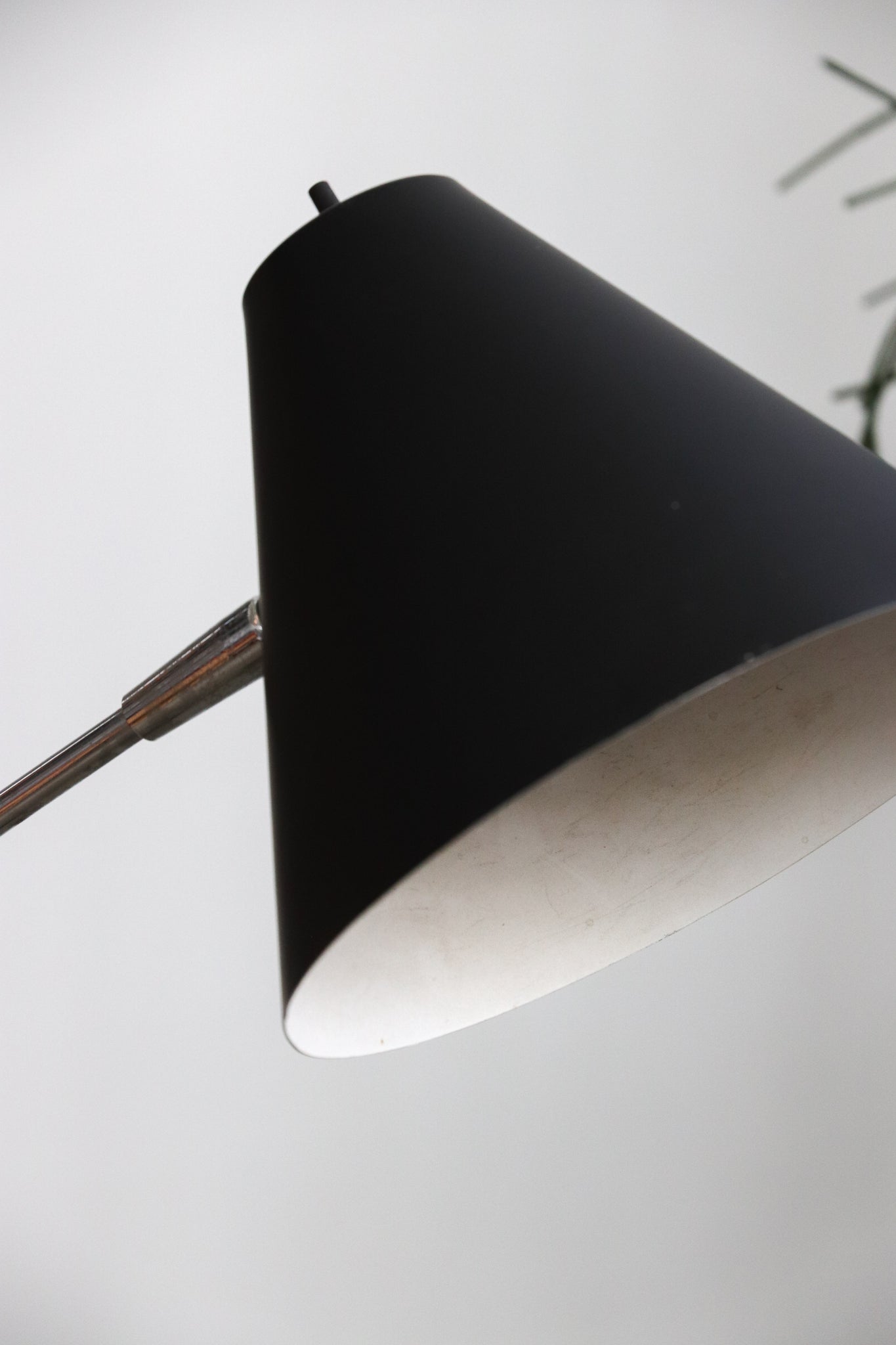 Articulating / adjustable mid century task floor lamp featuring a metal cone shade, an iron circular base, and an adjustable hinge/slide mechanism for the arm. In good vintage condition with light wear throughout such scratches, scuffs, minor dents, and patina throughout. See photos for reference. See photos for reference. If you'd like additional details or photos you can email us to inquire. No manufacturing markings present.