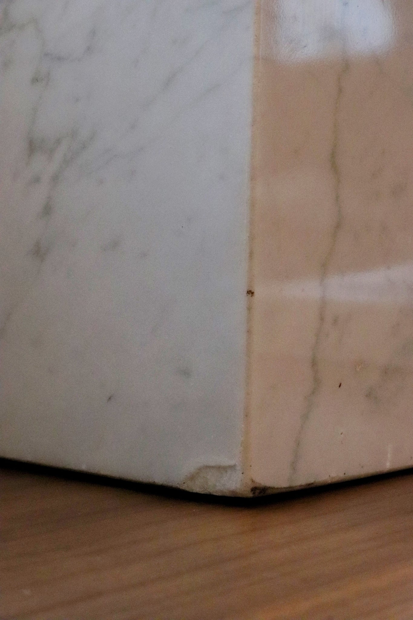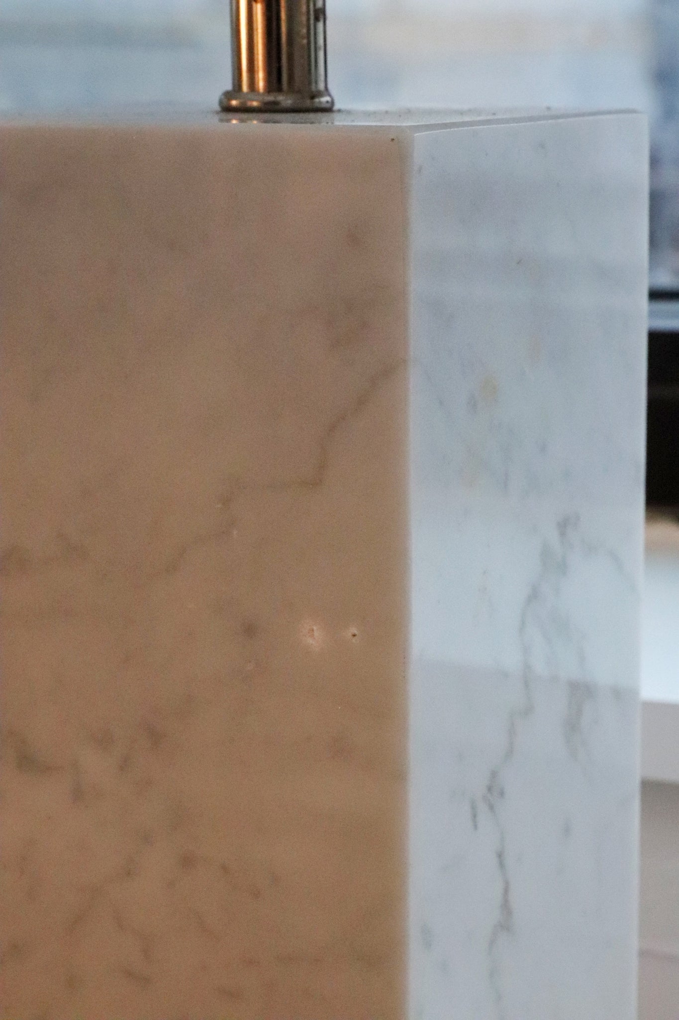 Carrara marble table lamp paired with a contemporary sand drum shade. In good vintage condition with light wear such as scuffs, scratches, minor dings, and age appropriate patina throughout.