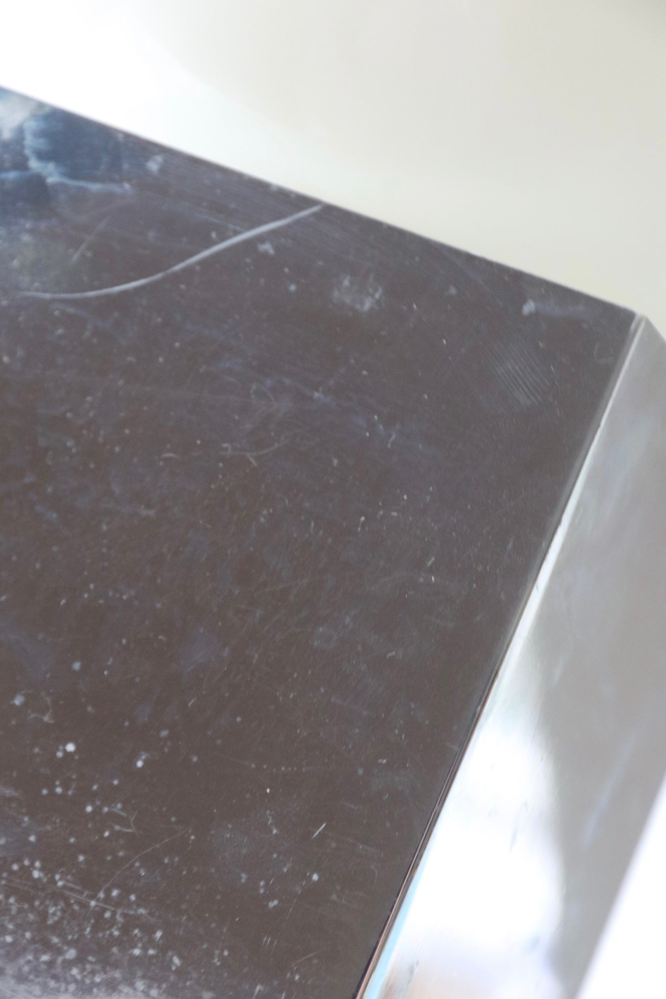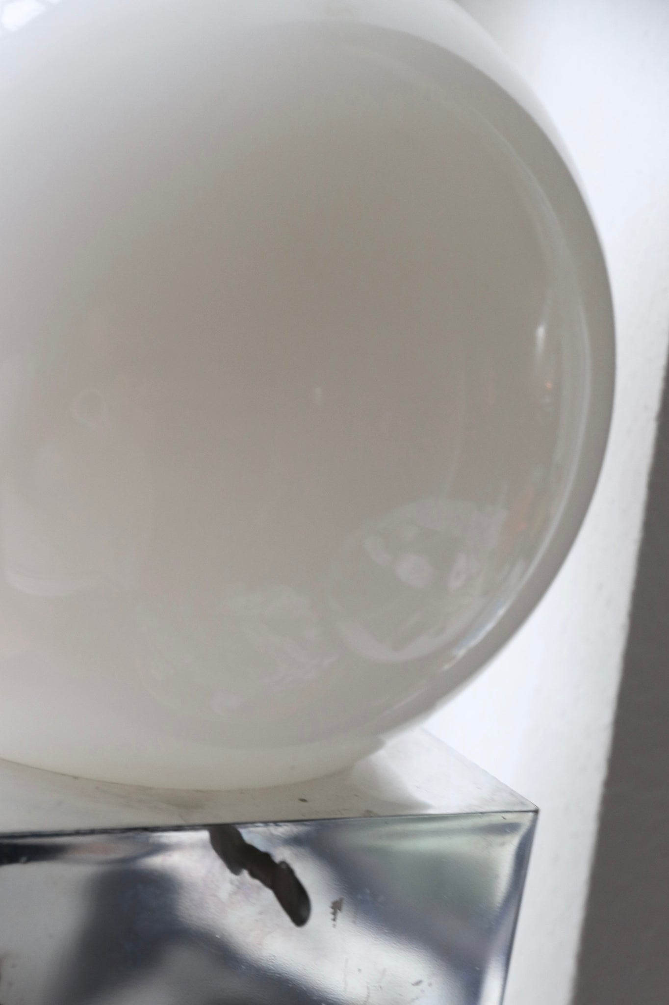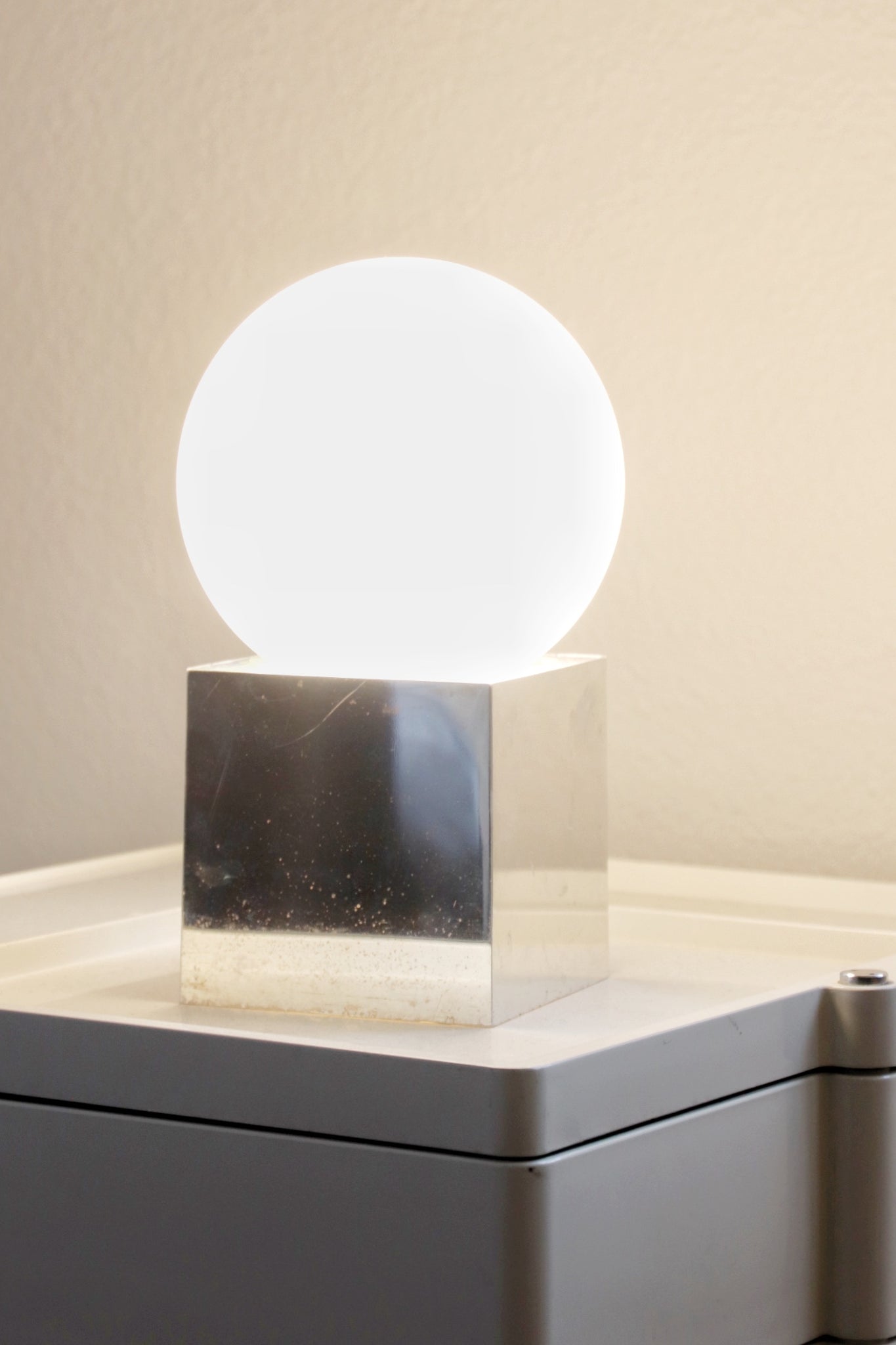 Chrome cube lamp with a glass globe. In good vintage condition with light surface wear such as light scuffs, scratches, and dings throughout base with no chips or cracks in the glass.