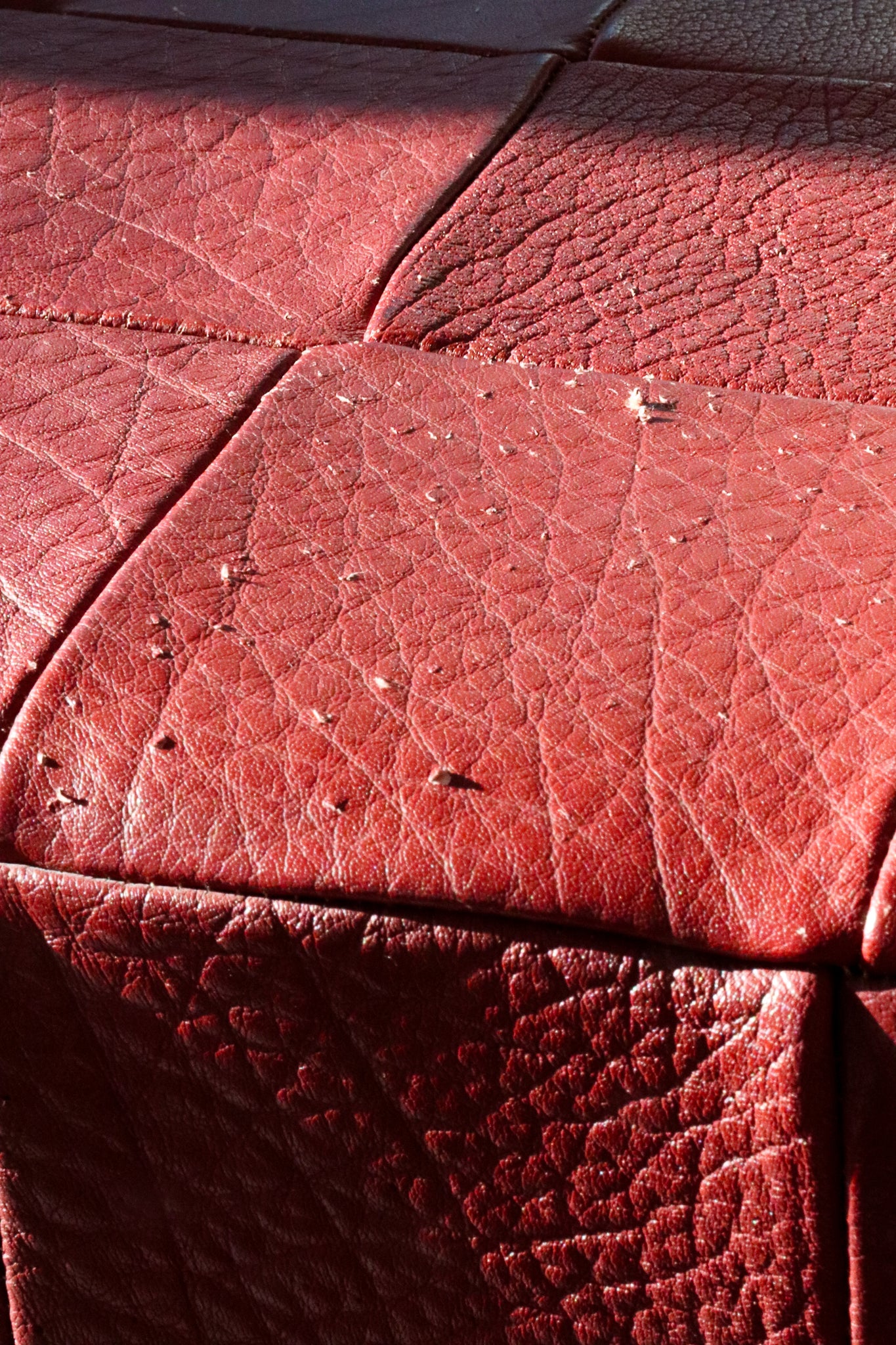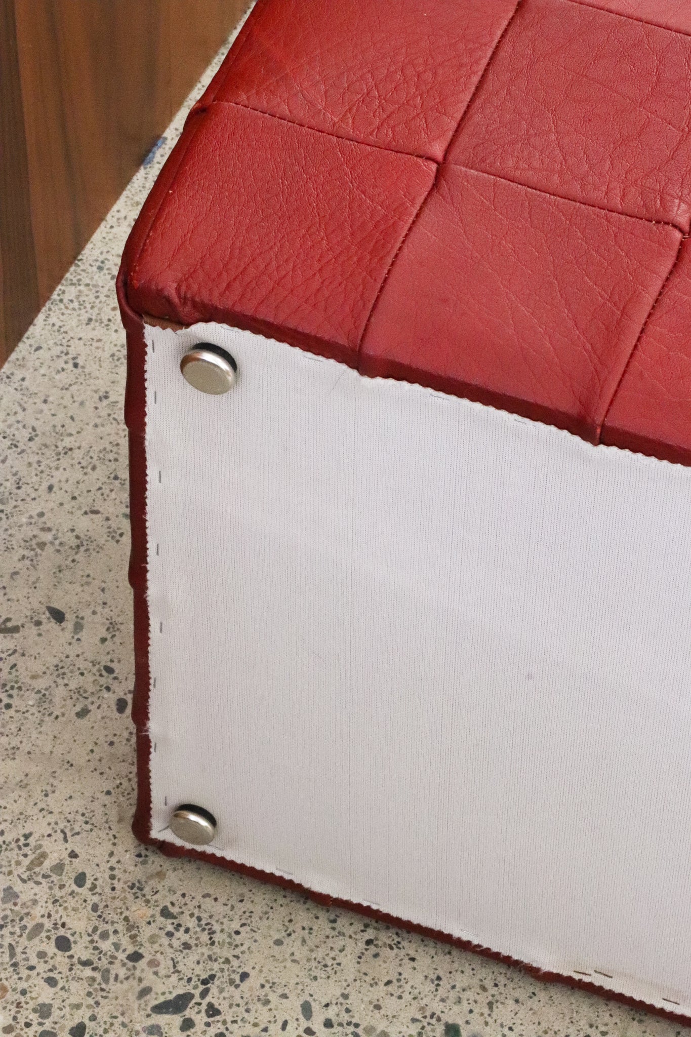 (1) Black — Condition of black leather ottoman shows signs of usage such as light punctures throughout top with minor wear such as and patina and scuffing throughout. (1) Red — Condition of red leather ottoman shows more signs of usage such as punctures throughout top with minor wear such as and patina and scuffing throughout.