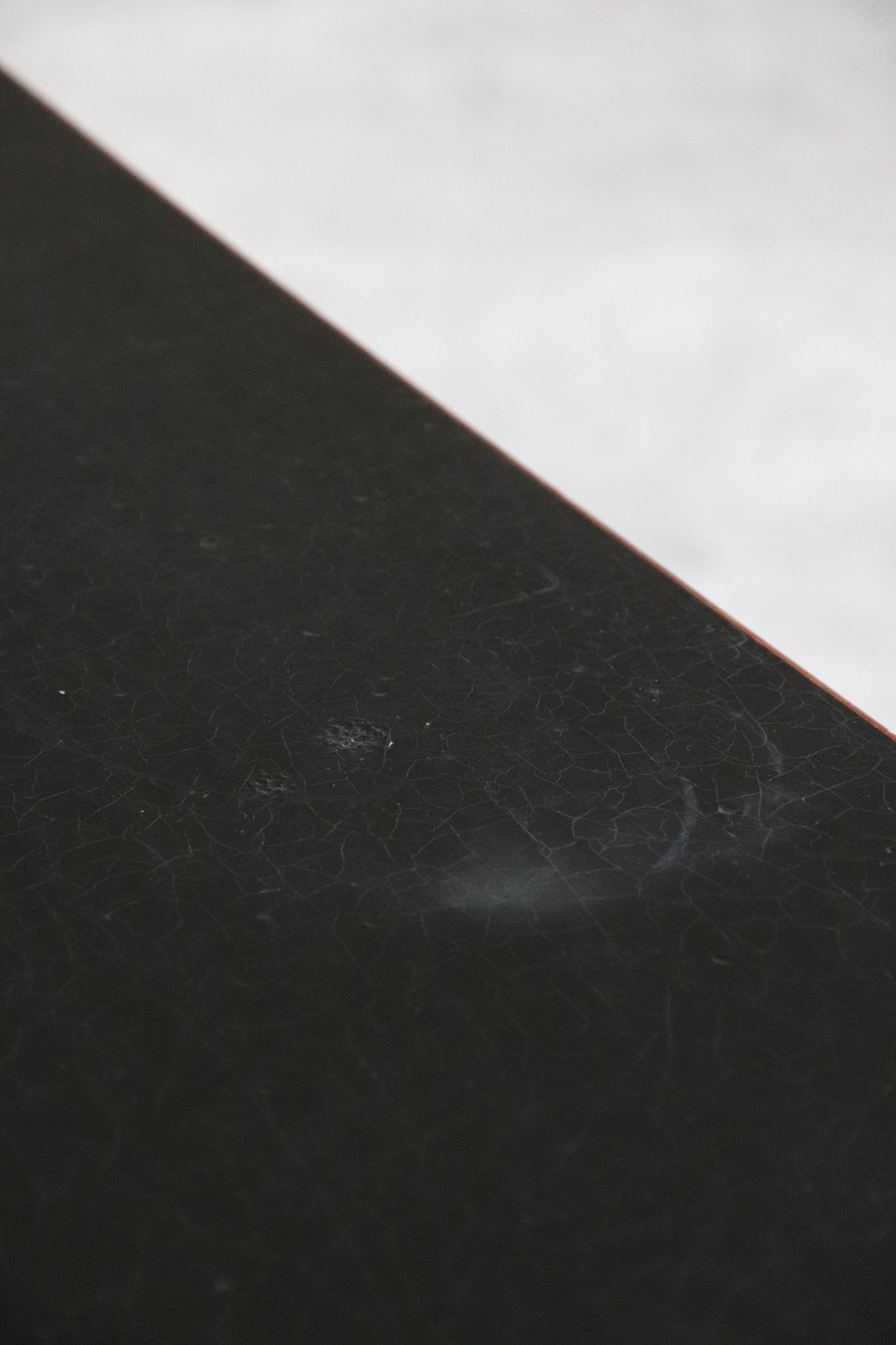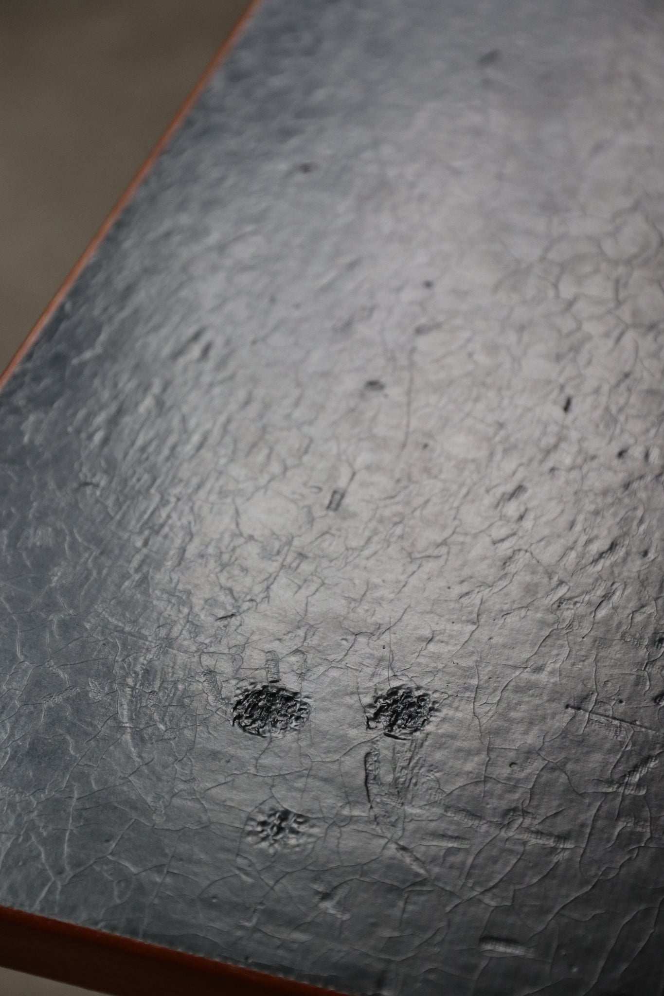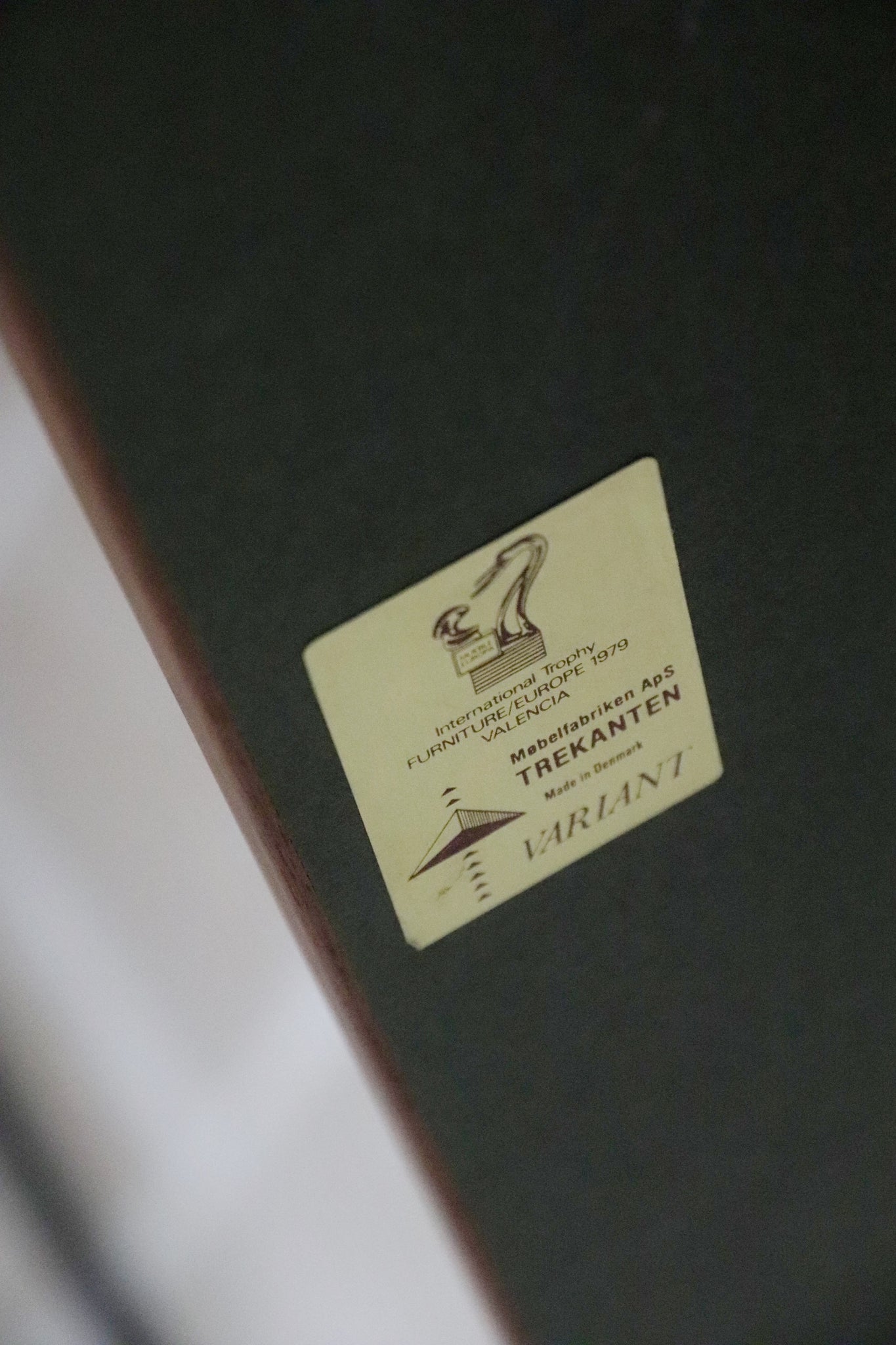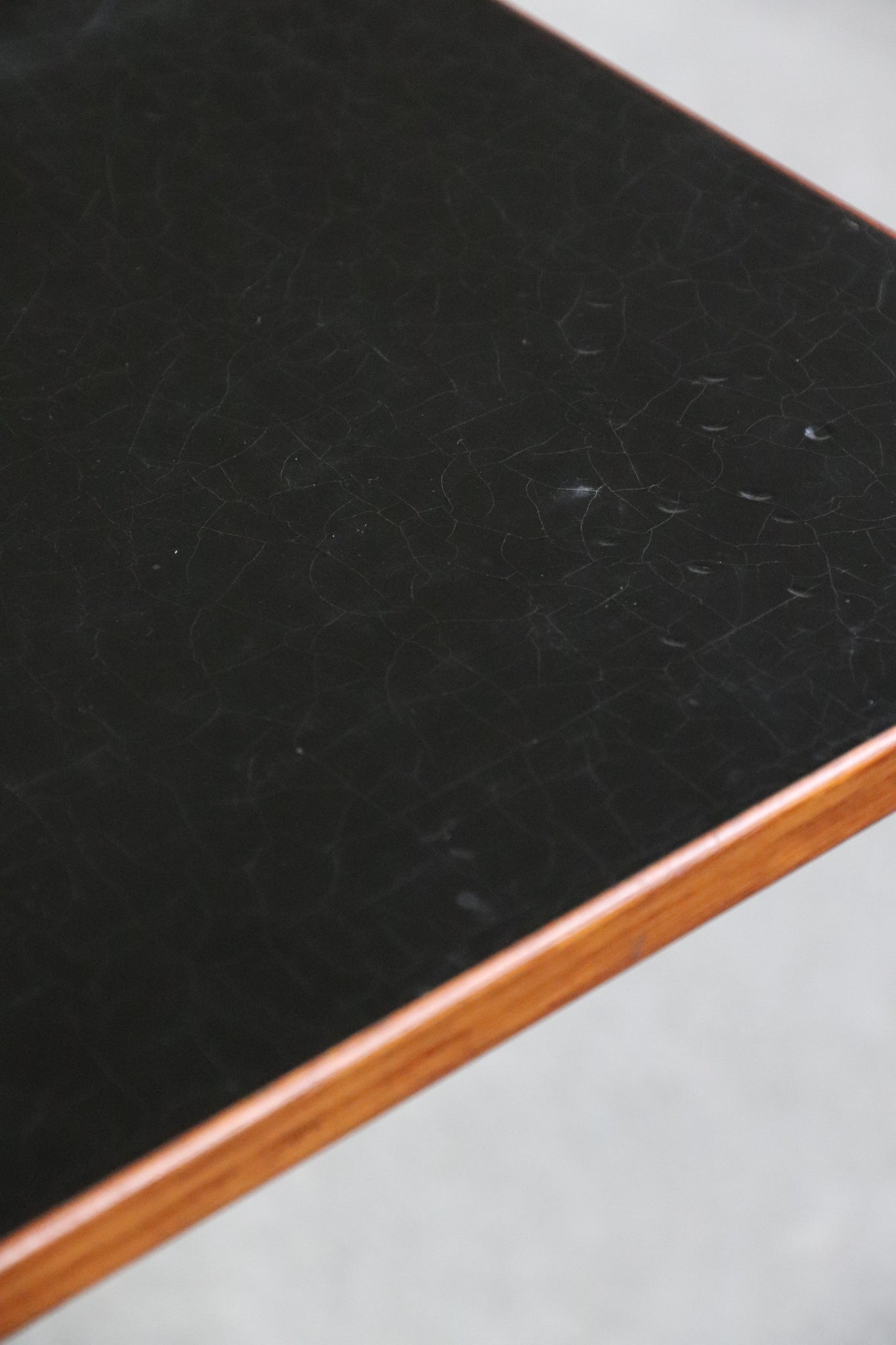 Danish Modern teak drafting table by Mobelfabrikken Trekanten. This drafting desk features a matte black top with a tilting mechanism and adjustable trestle legs. In good vintage condition— desk top shows significant wear such as consistent crazing throughout with age appropriate dents, scuffs, scratches, and patina. Light surface wear such as scuffs, scratches, and patina throughout wood base with one area of veneer cracked in the leg. Left side of the table has some resistance when adjusting height but still functions as it should and can be set to any height. Table top is lightly warped towards front center. See last photos for reference. If you'd like additional details or photos you can email us to inquire. Made in Denmark.