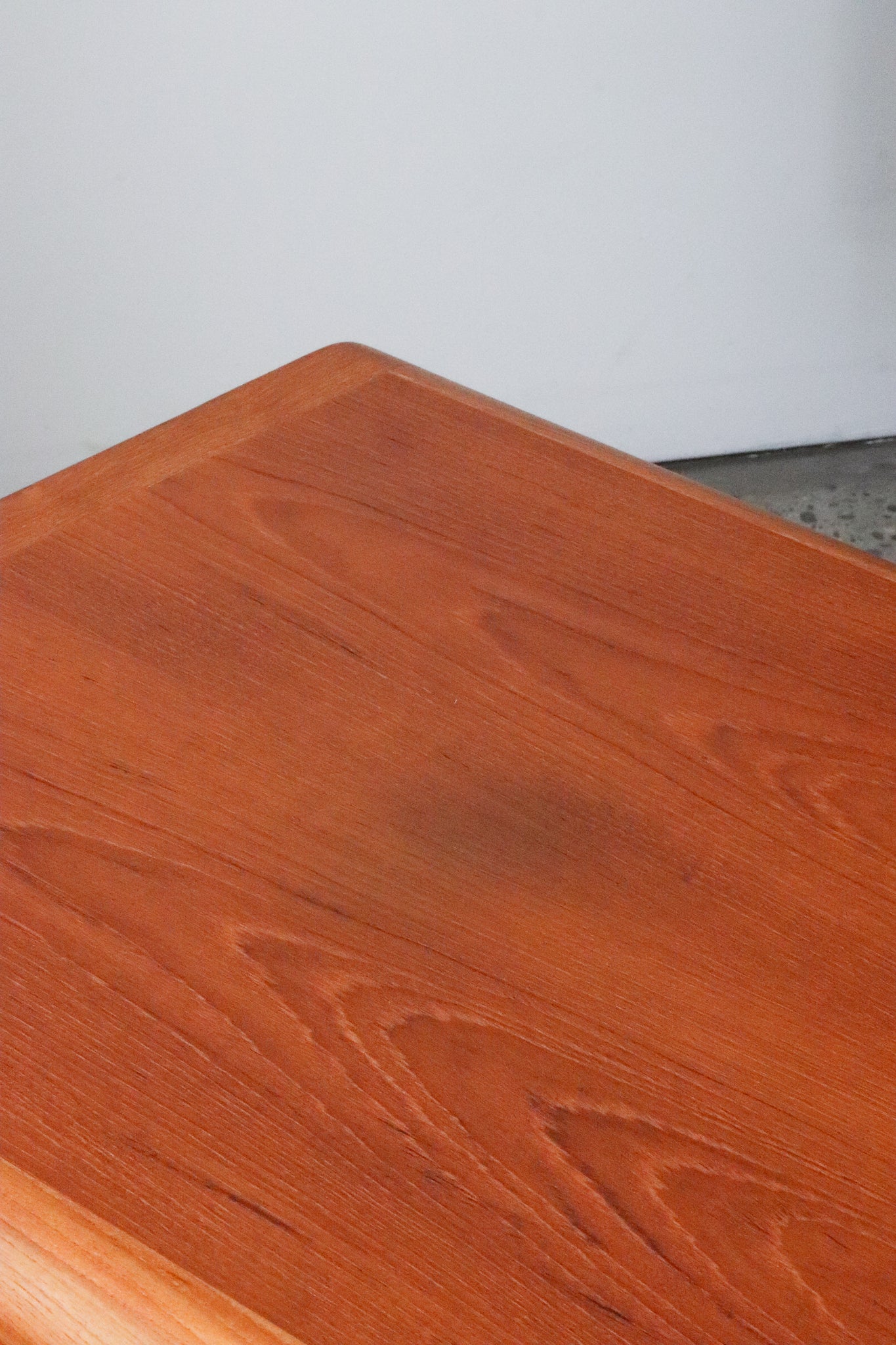 Pair of Danish two-toned teak end tables with rounded edges and pedestal base by Vejle Stole & Mobelfabrik. In good vintage condition with one darkened spot on one end table about 3" in diameter. See photos for reference, if you'd like additional details or photos you can email us to inquire.