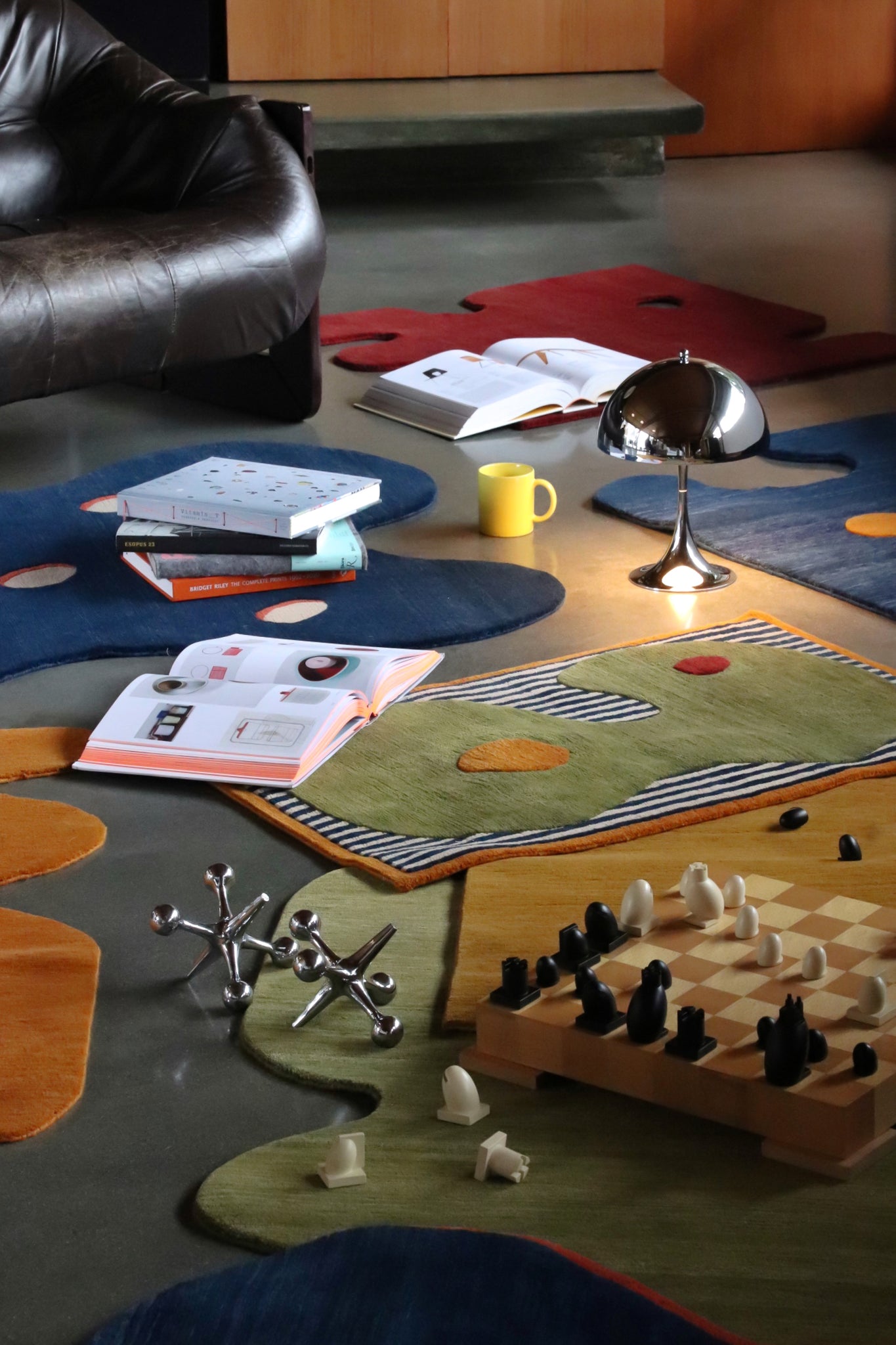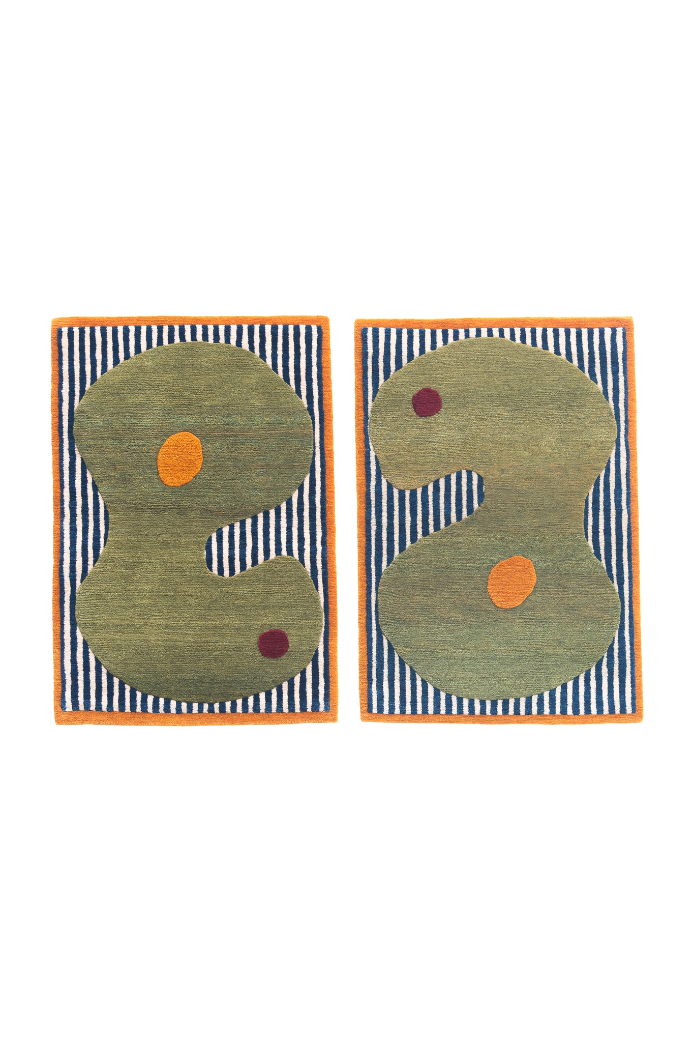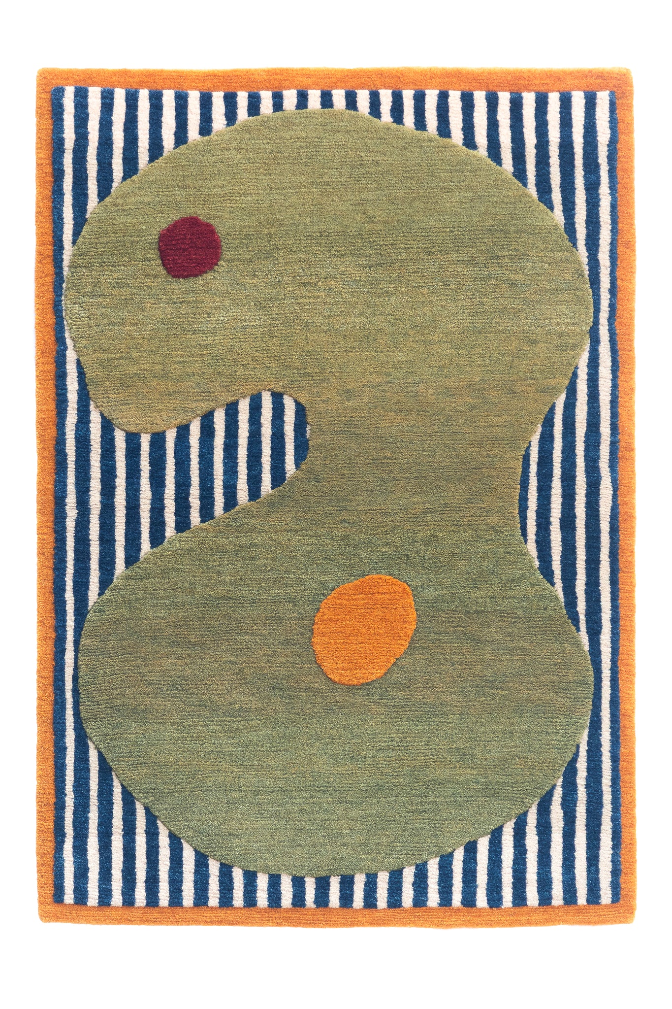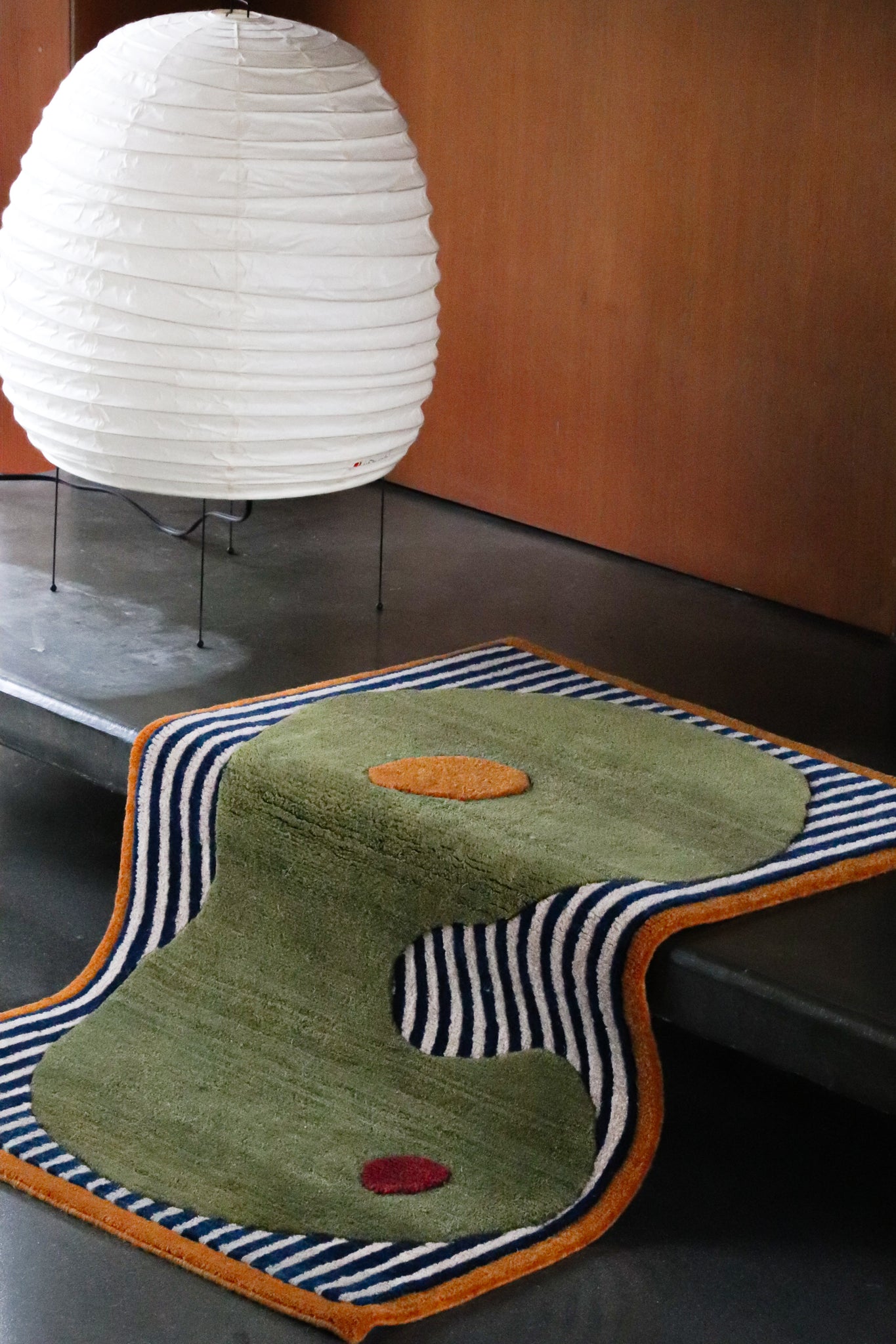 These eight hand-knotted rugs borrow from Noguchi's vocabulary: biomorphic shapes, puzzle-piece edges, organic cutouts outlined in contrasting colors. The bright primary colors are taken from his two completed playgrounds: Playscapes in Atlanta (1976) and Moerenuma Park in Sapporo (2005). Deep indigo, vibrant marigold and orange, burgundy wine, sage green.