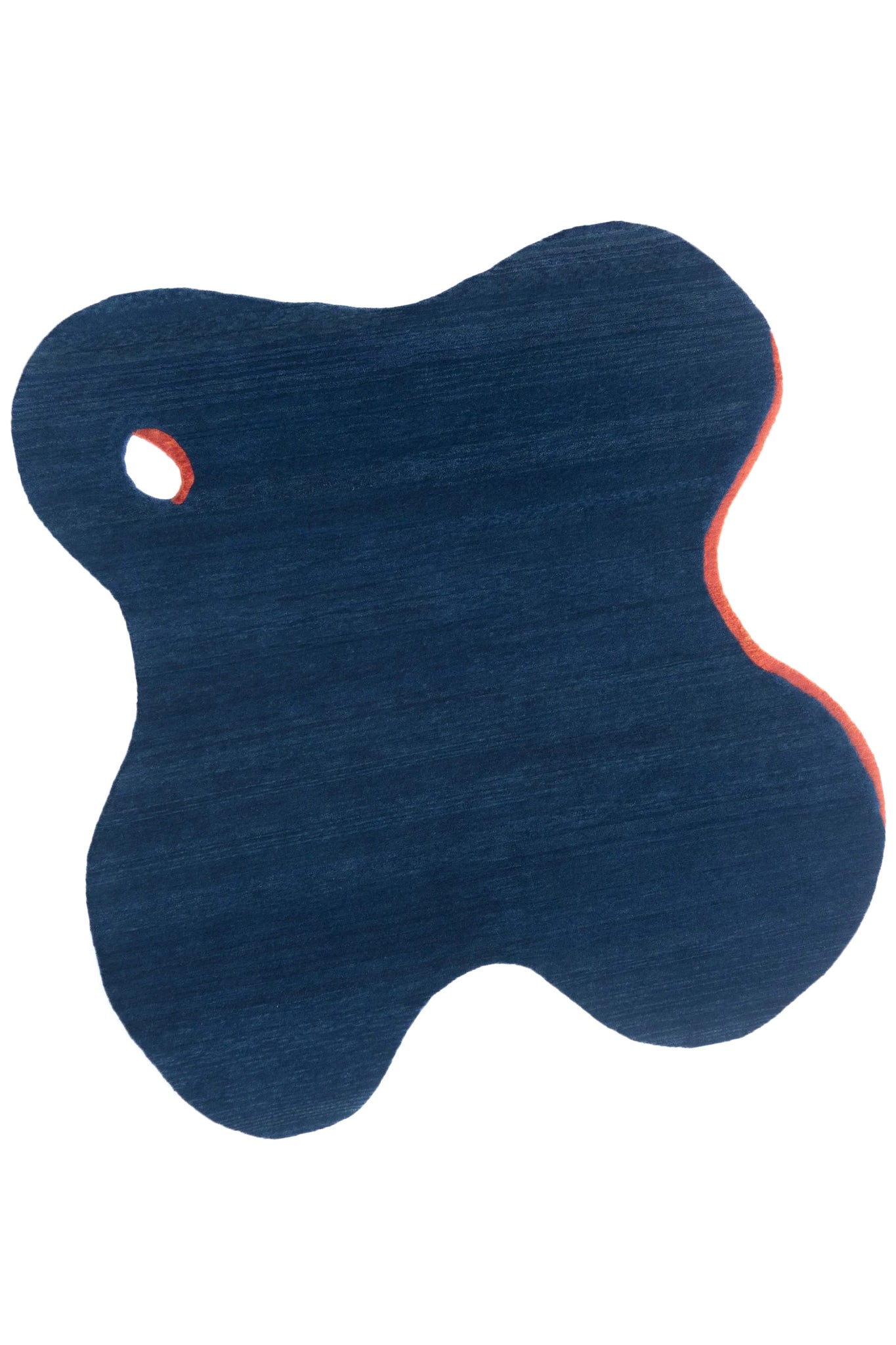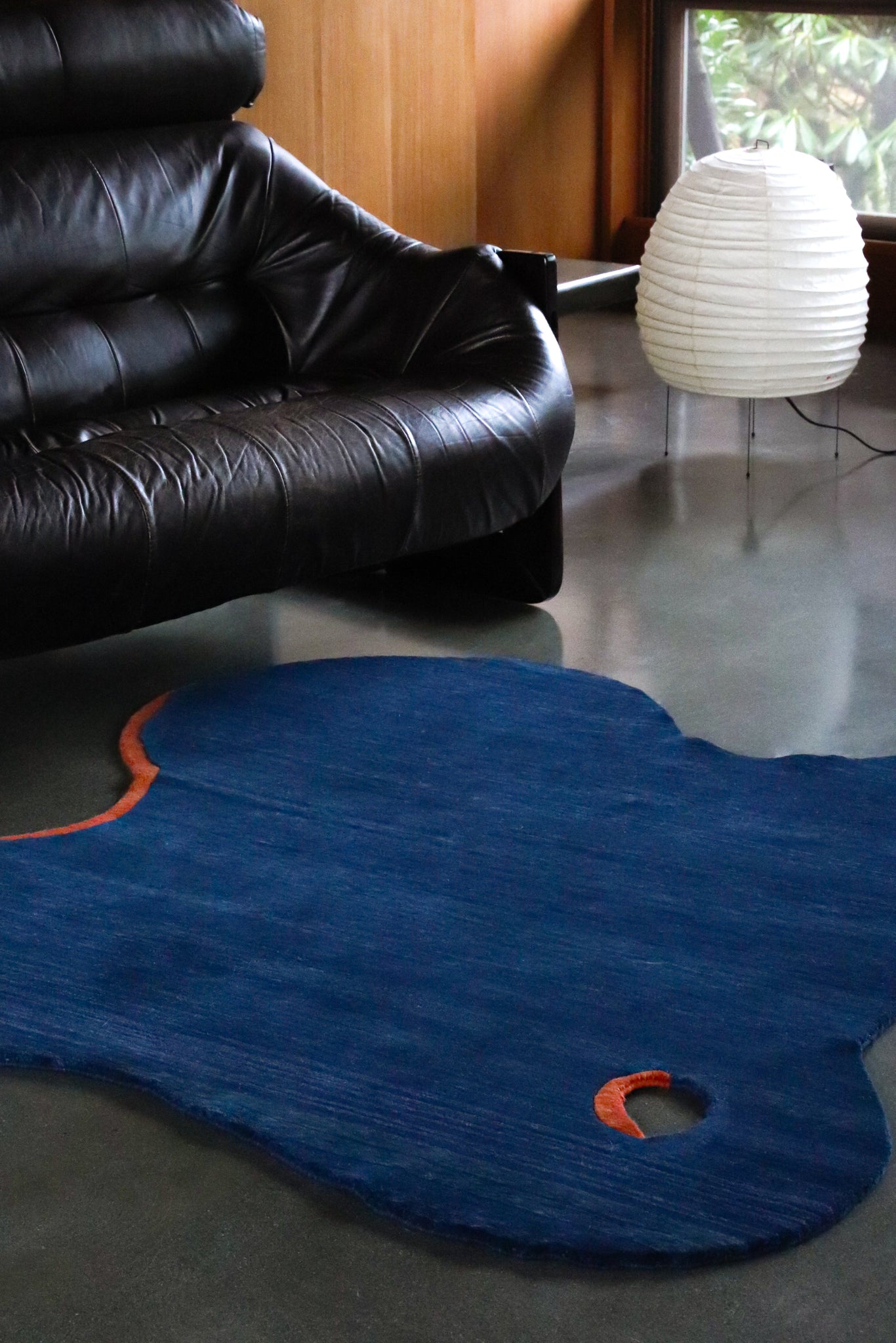 These eight hand-knotted rugs borrow from Noguchi's vocabulary: biomorphic shapes, puzzle-piece edges, organic cutouts outlined in contrasting colors. The bright primary colors are taken from his two completed playgrounds: Playscapes in Atlanta (1976) and Moerenuma Park in Sapporo (2005). Deep indigo, vibrant marigold and orange, burgundy wine, sage green.