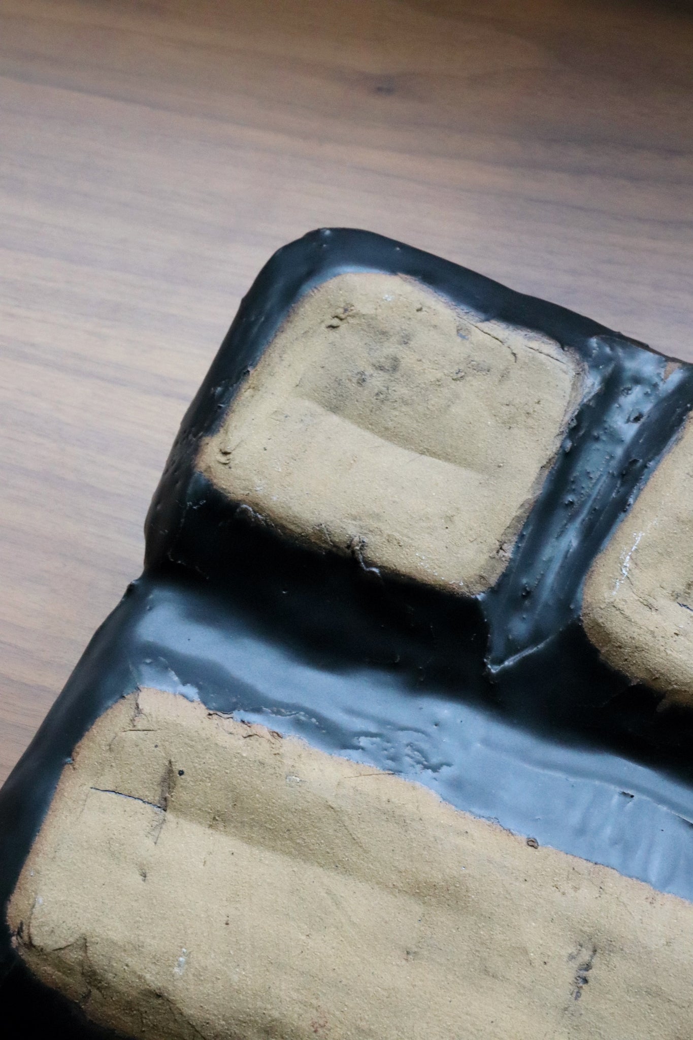 Handmade pottery tray detailed with rigid and soft lines.