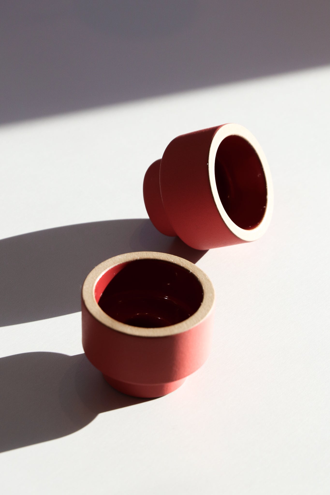 Pair of stackable ceramic candle holders by Heath in a crimson red glaze. Made to fit tea lights or candle tapers. In excellent condition.