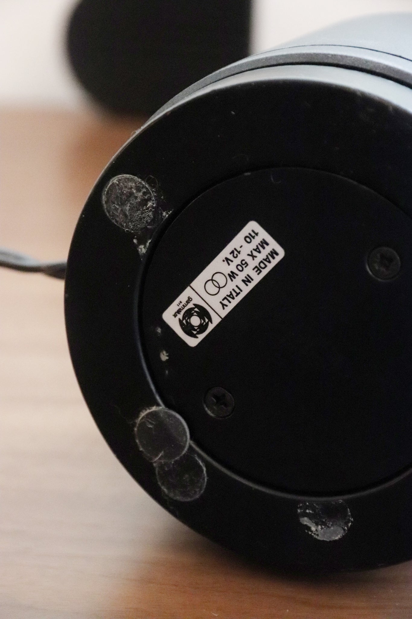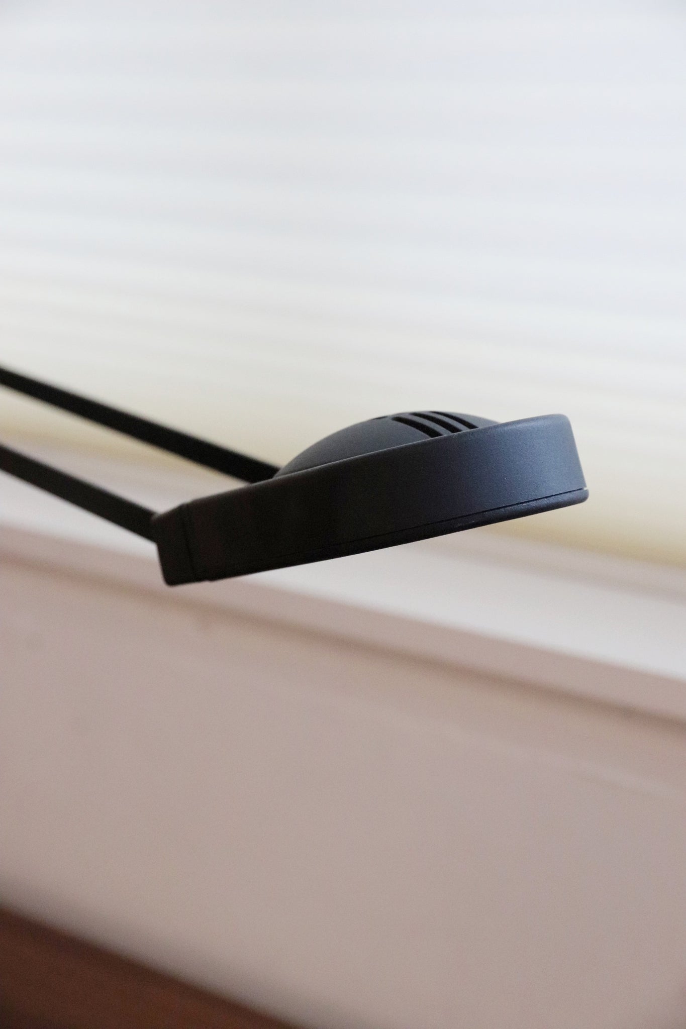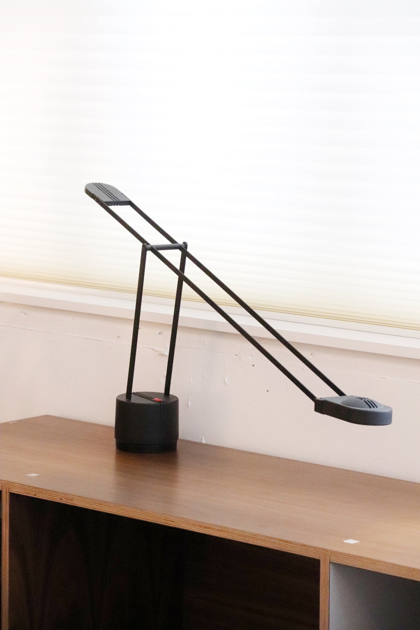 Articulating Italian black halogen task desk lamp by Gammalux. Lamp features two articulating joints with a rotating head mechanism and a low and bright light setting. In near excellent vintage condition with light wear and patina throughout. If you'd like additional details or photos you can email us to inquire. Made in Italy.
