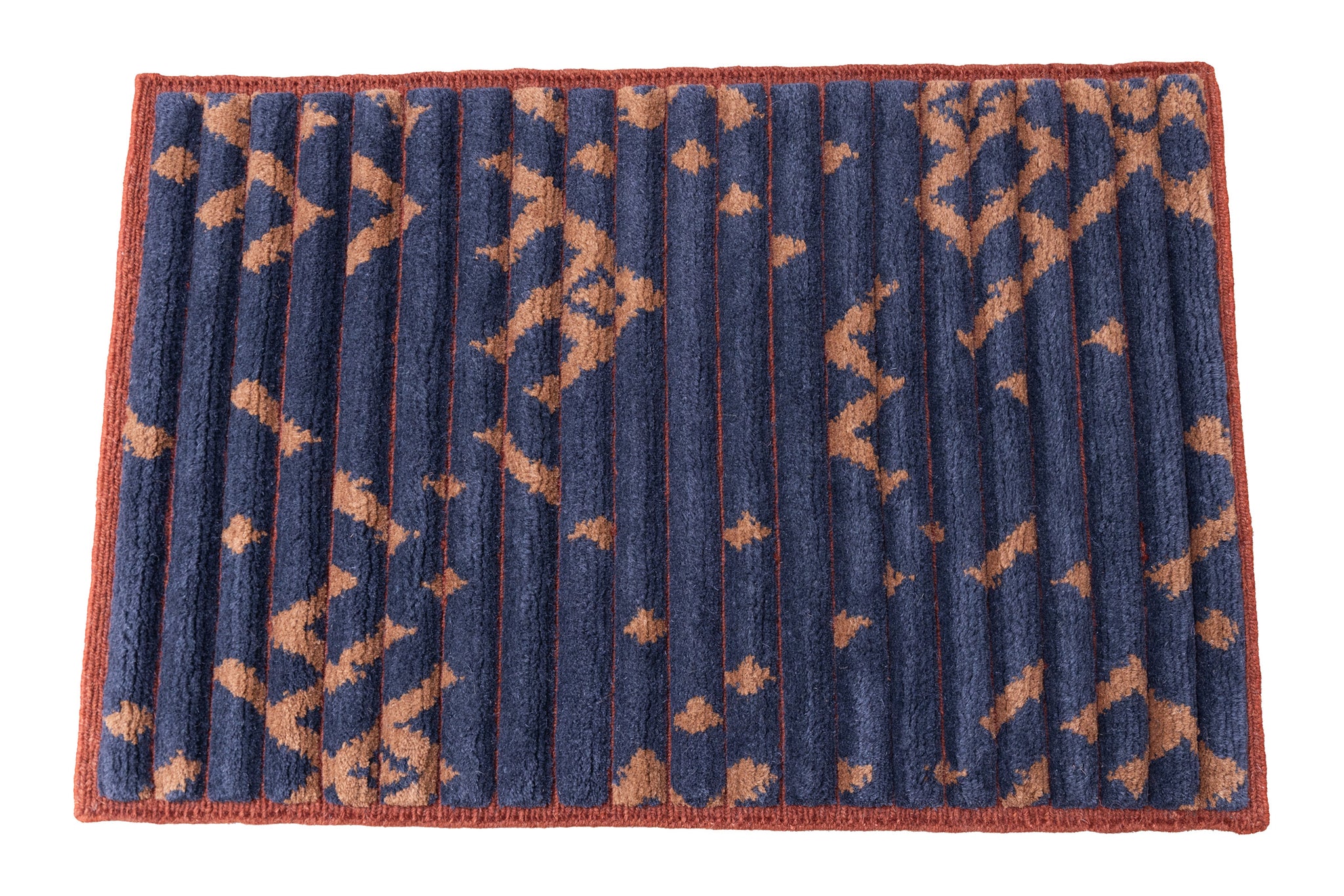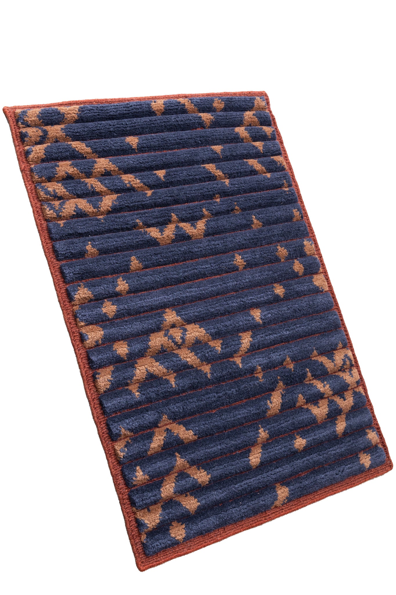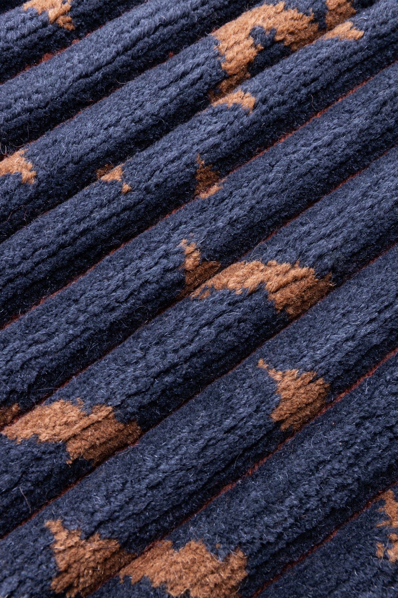 The Labyrinth rug features a deconstructed lattice pattern with three-dimensional scalloped horizontal stripes. Hand-knotted with rods of varying thicknesses to create dynamic pile variation and subtle topographical texture.
