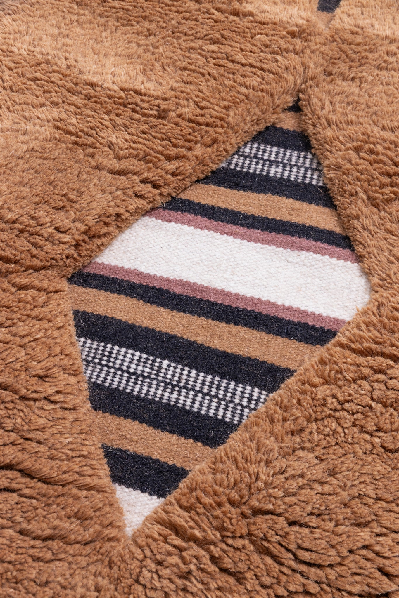 A walnut-brown background in a luxurious pile layered over a Tibetan blanket pattern called Liwu.