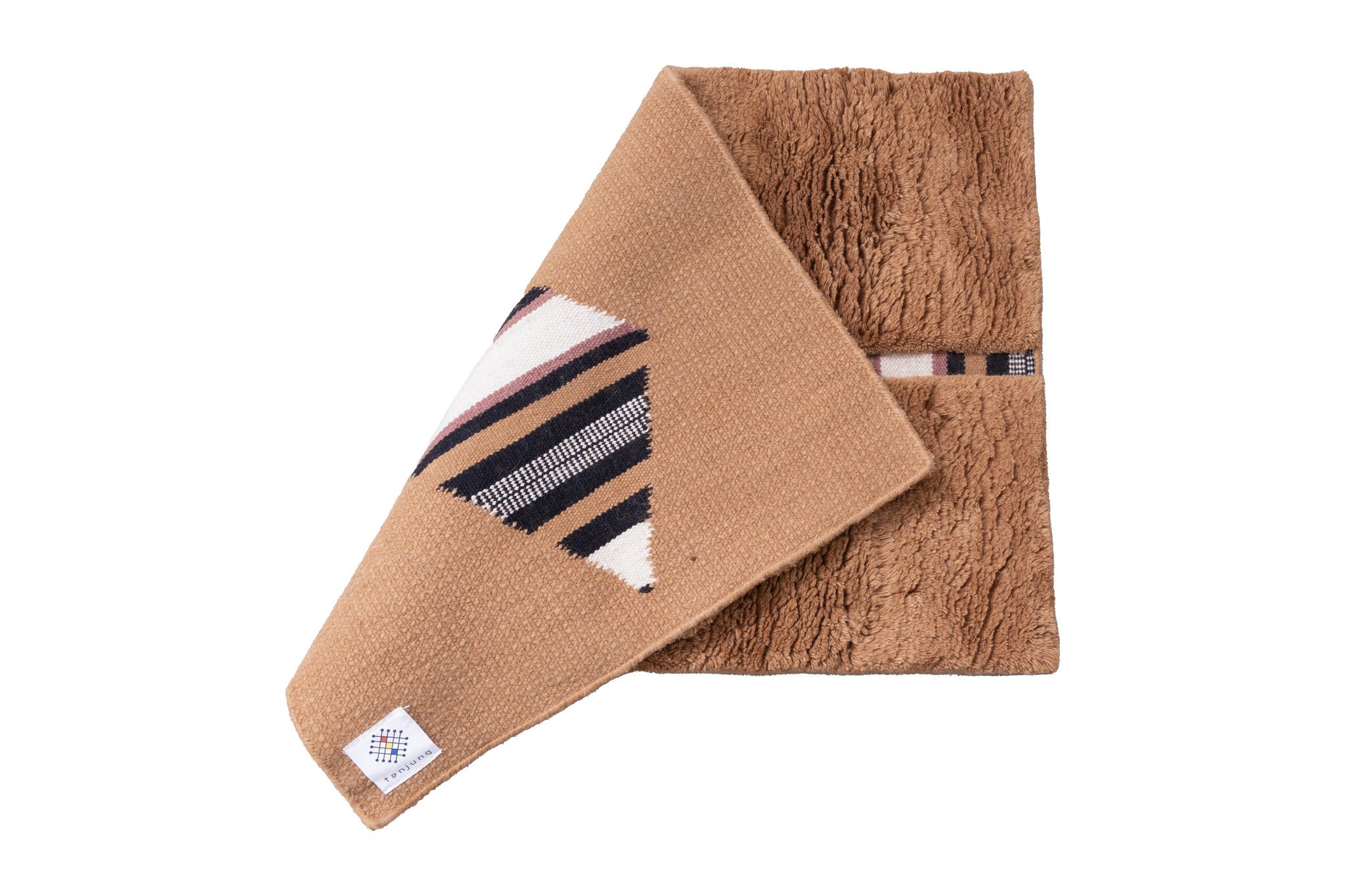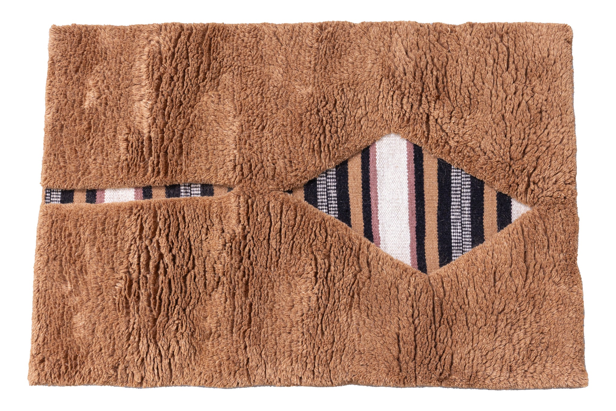 The Liwu with Pile rug features a minimalist yet striking design, defined by its golden-brown backdrop and distinctive geometric cut-outs. Horizontal square openings and diamond-shaped details reveal a bold striped Liwu, a traditional Tibetan blanket pattern underneath.