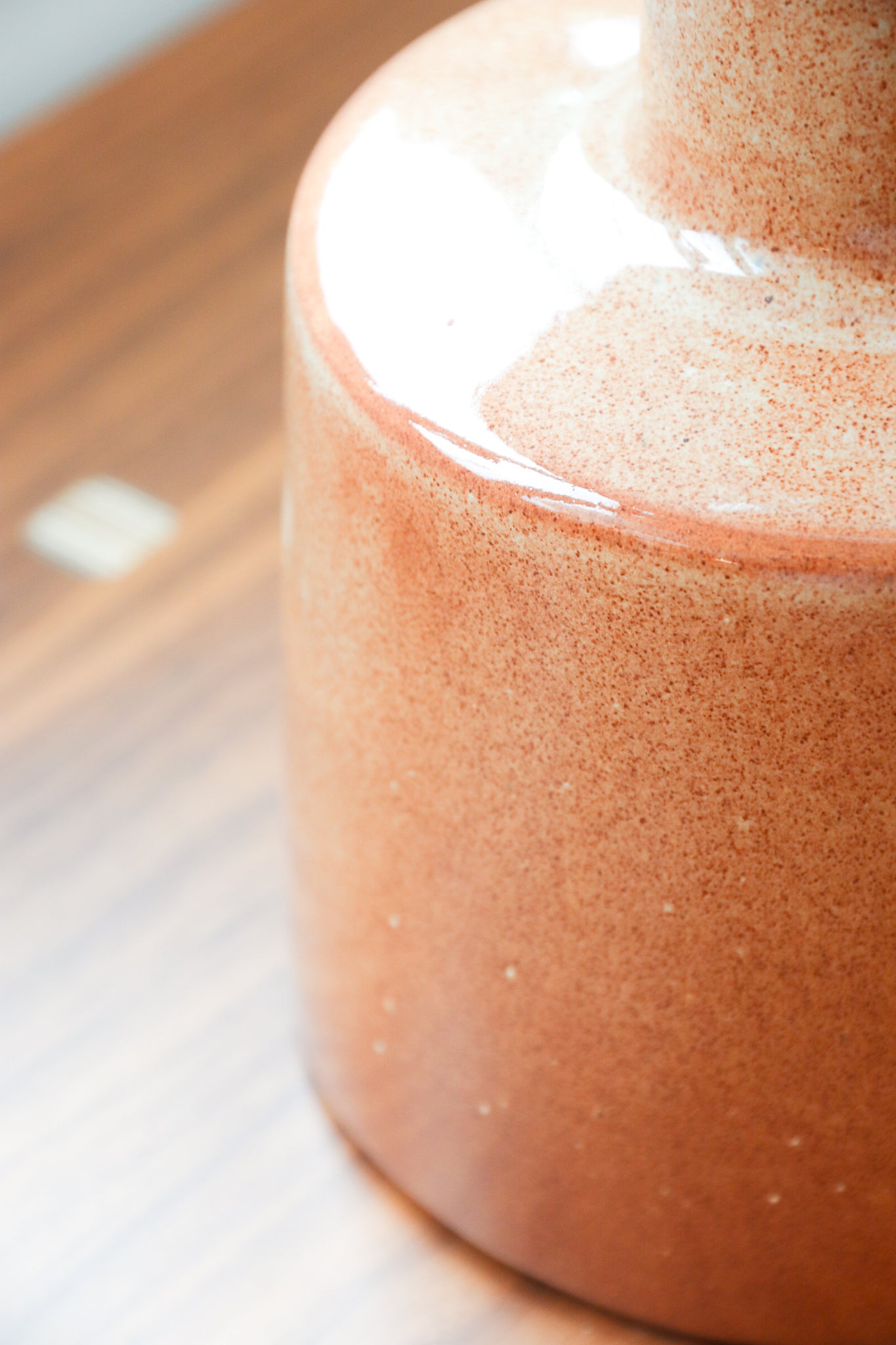 Mid Century ceramic table lamp by Gordon & Jane Martz for Marshall Studios. Lamp features a short squatted silhouette with an earthy orange/ taupe / grey speckled glaze. Paired with a small contemporary drum cream shade made in Seattle, WA by Harold's Lighting. In very good vintage condition with light patina throughout. See photos for details. No chips or cracks throughout. If you'd like additional details or photos you can email us to inquire. Signed.