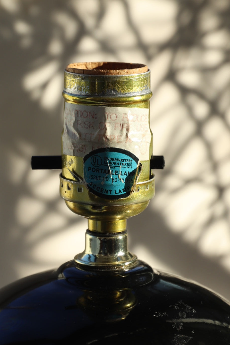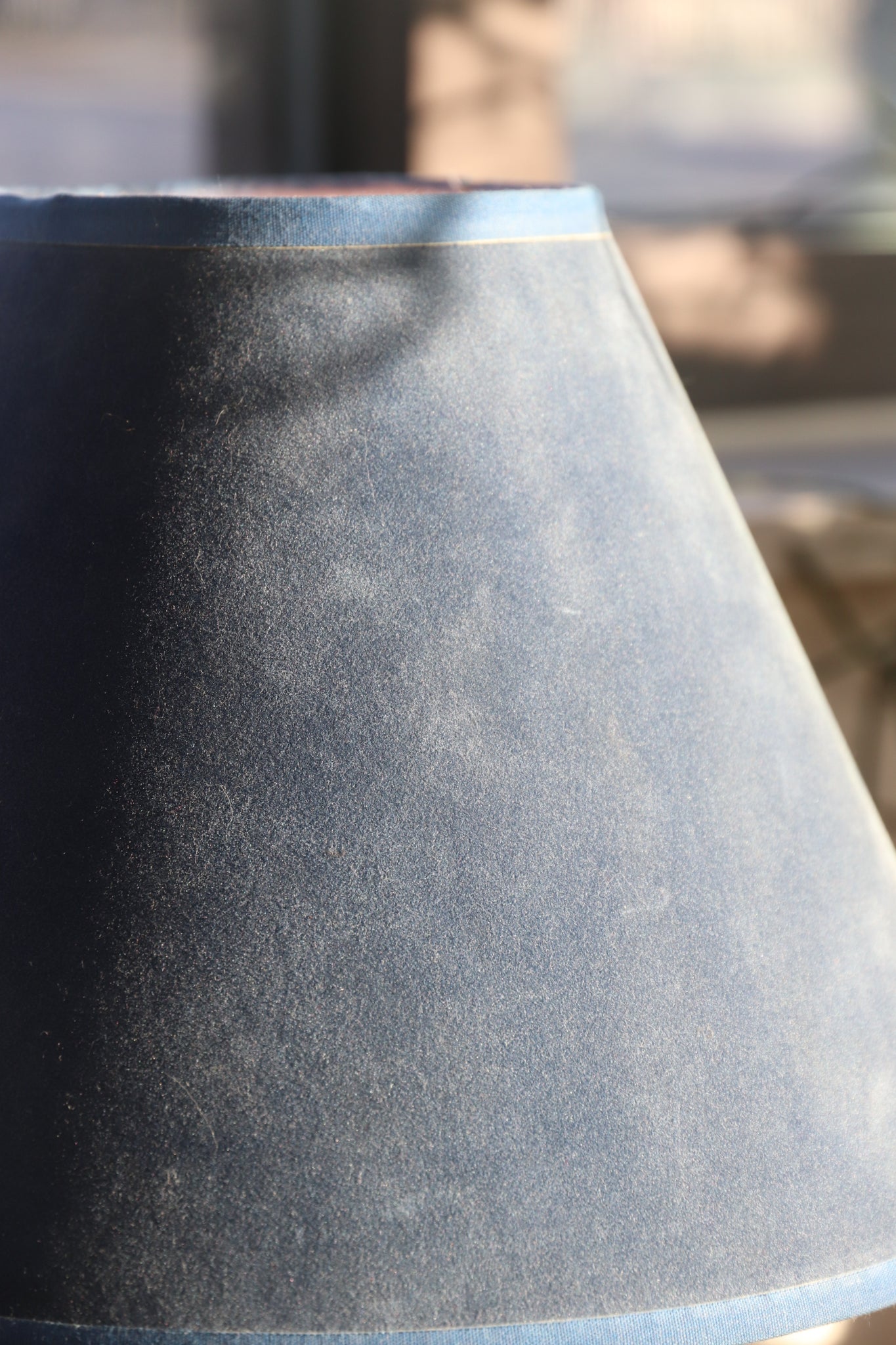 Mini black ceramic sphere lamp paired with a vintage blue empire shade. In good vintage condition with age appropriate wear and patina throughout.