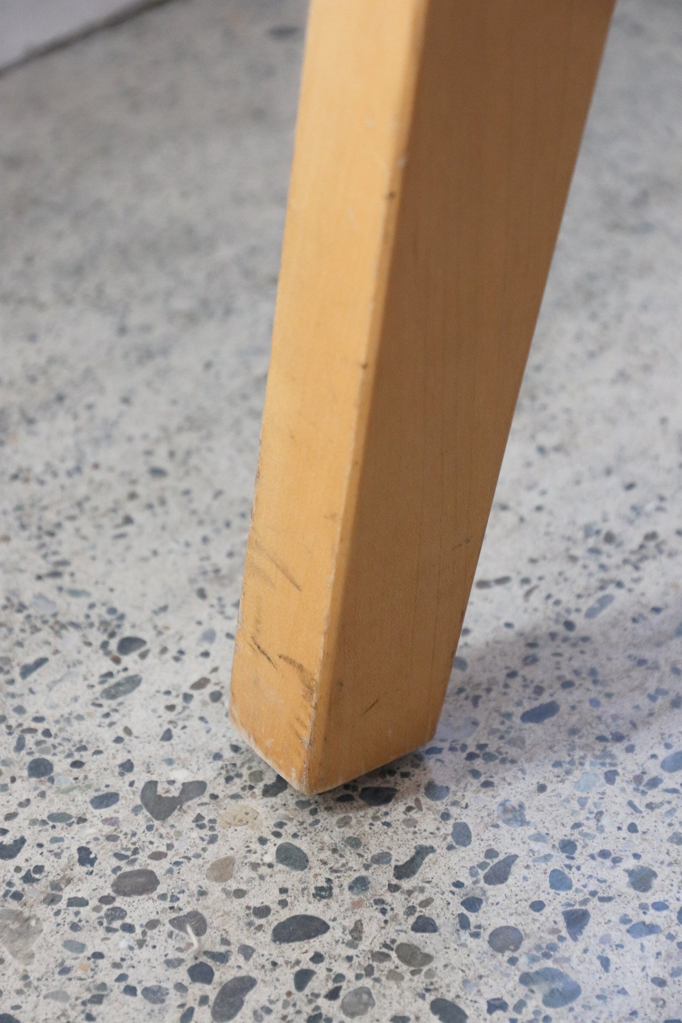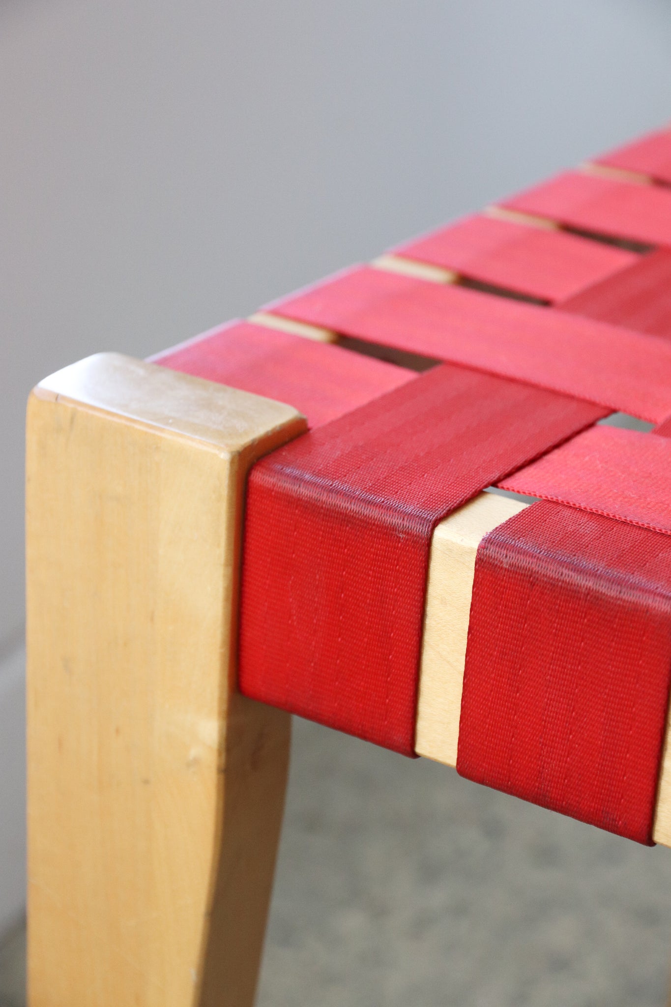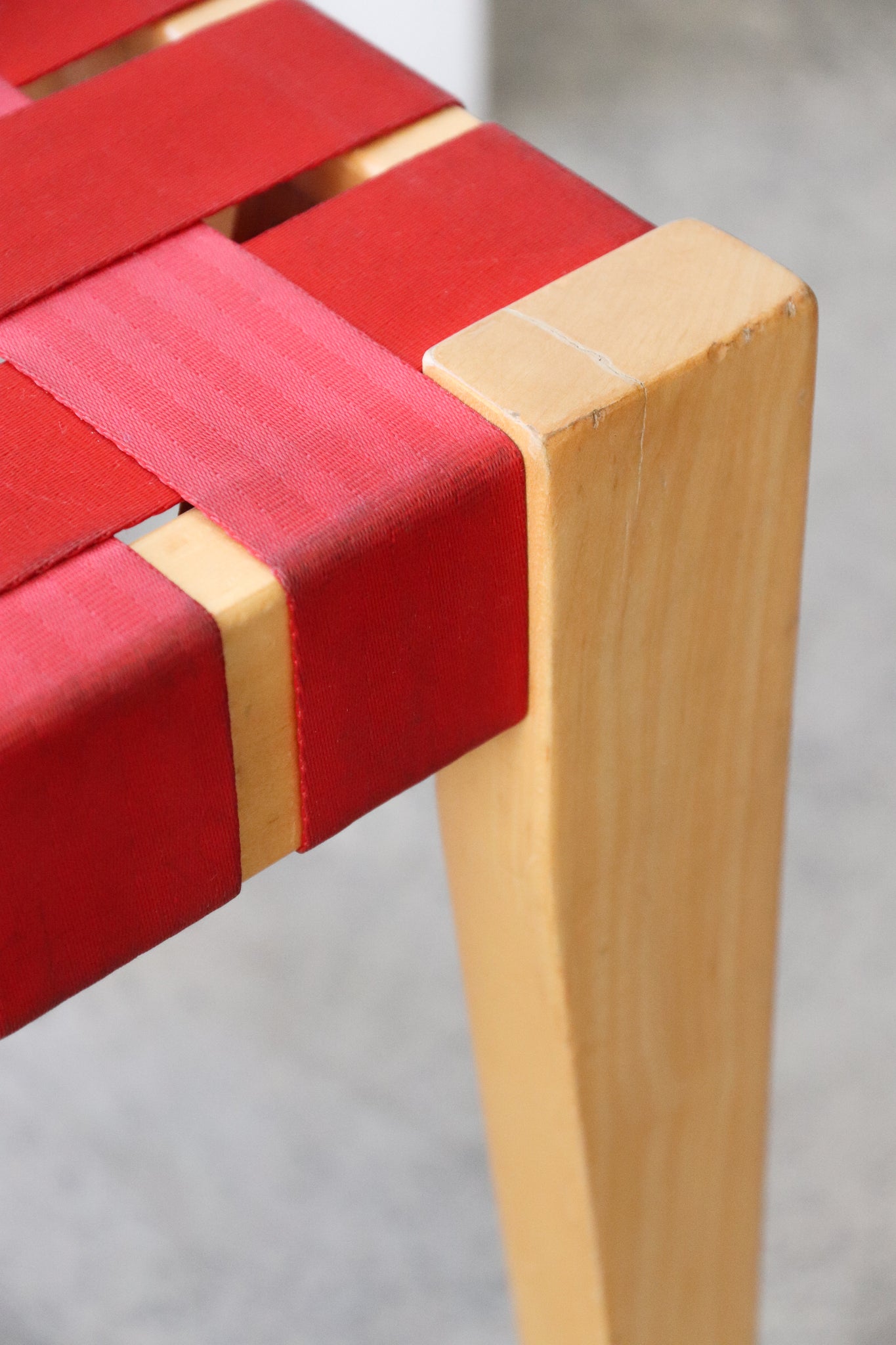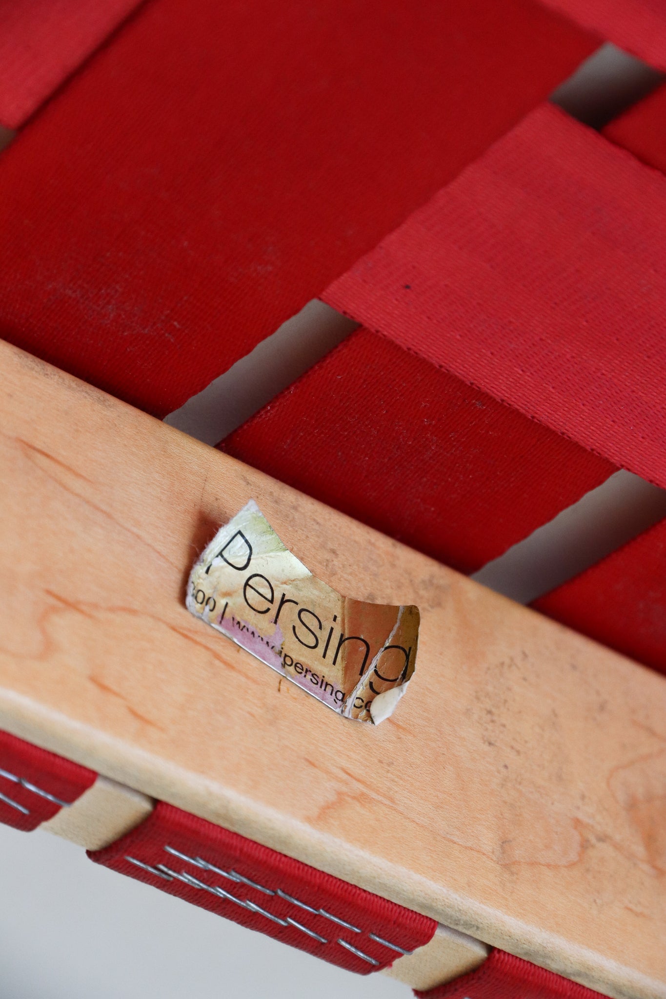Contemporary pair of modern dining chairs featuring a sleek light wood frame with red woven webbing upholstery. Each chair is in good condition with some scuffs, scratches, and patina throughout frame with patina showing in the webbing upholstery. See photos for reference, if you'd like additional details or photos you can email us to inquire.