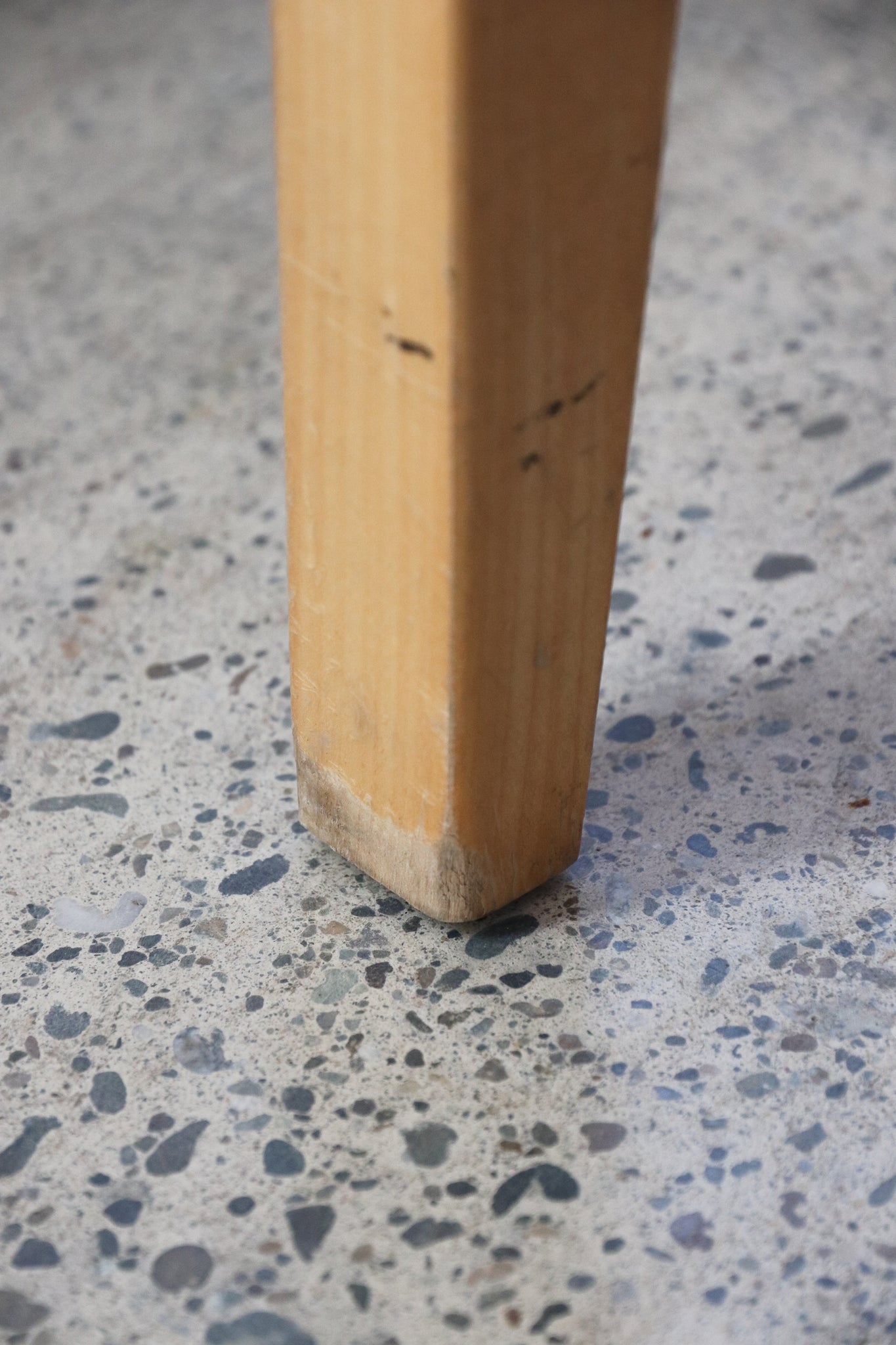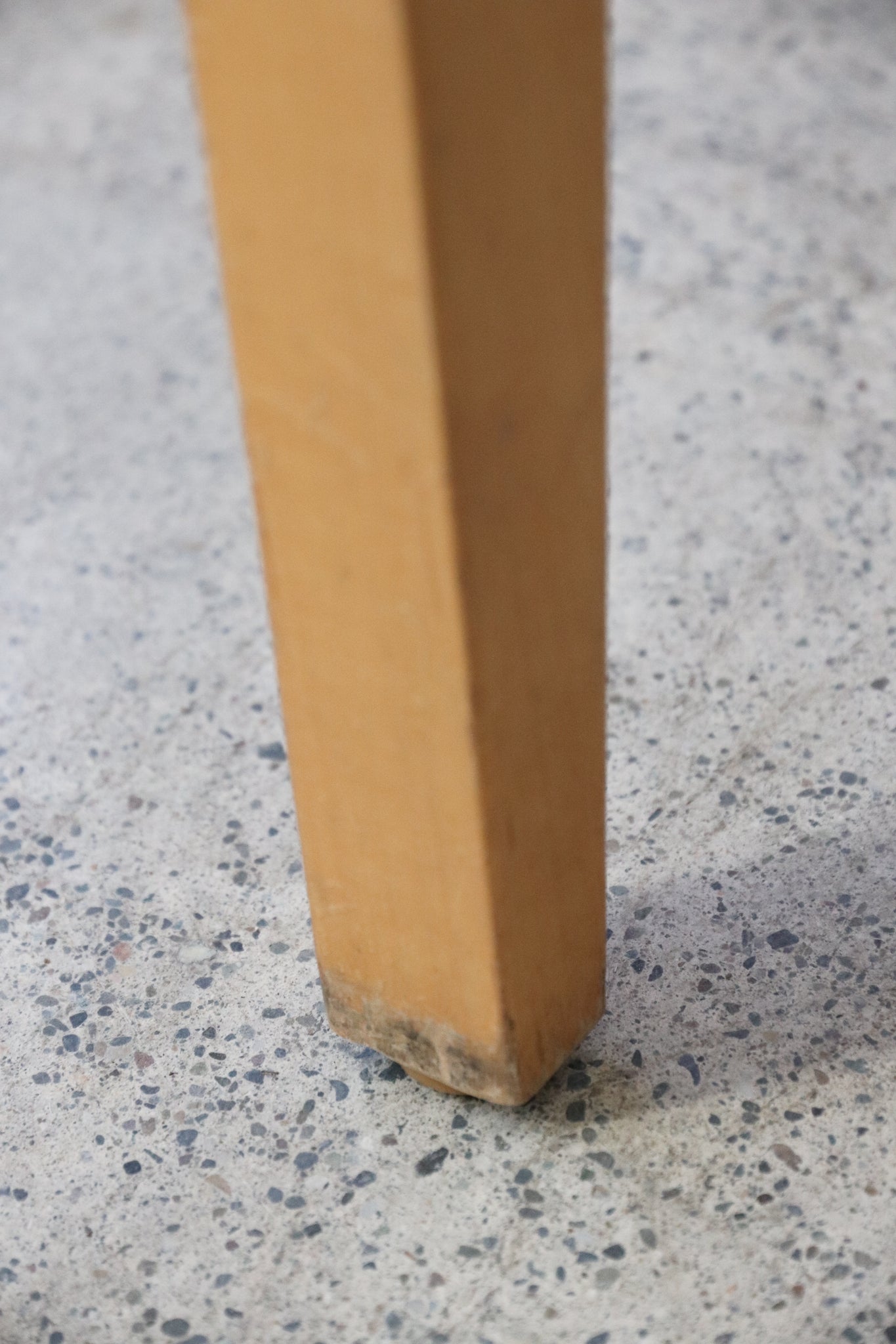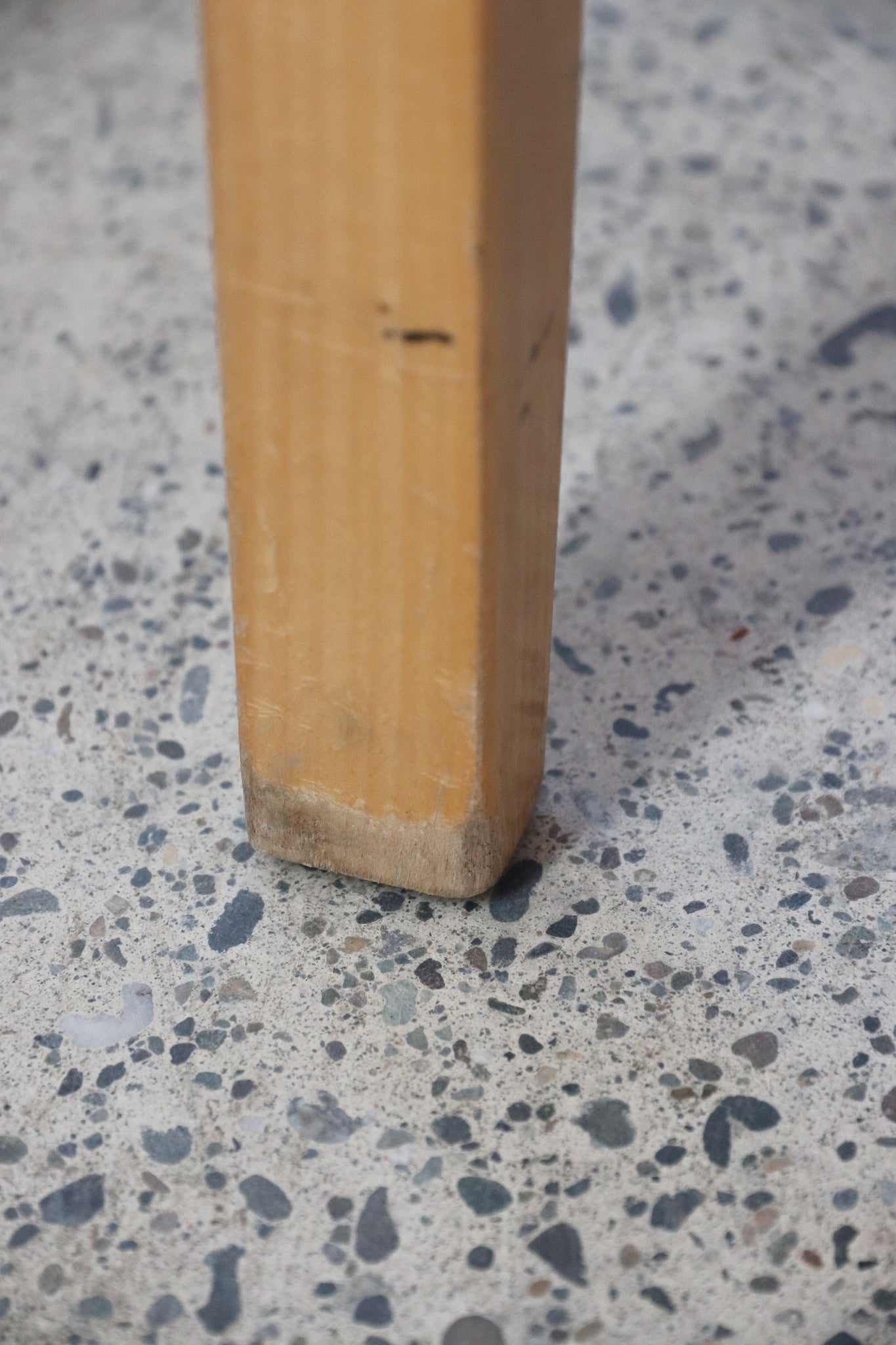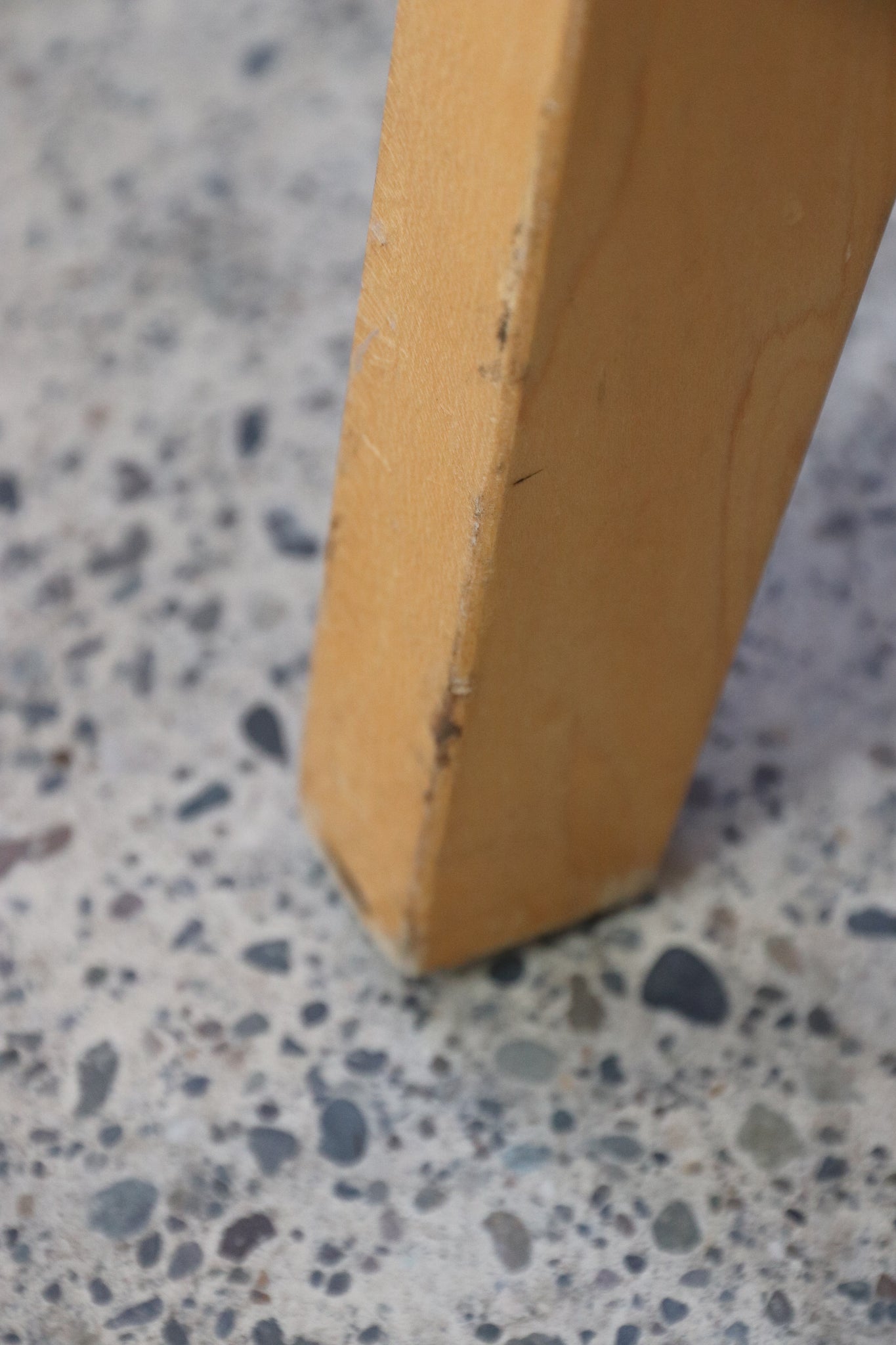 Contemporary pair of modern dining chairs featuring a sleek light wood frame with red woven webbing upholstery. Each chair is in good condition with some scuffs, scratches, and patina throughout frame with patina showing in the webbing upholstery. See photos for reference, if you'd like additional details or photos you can email us to inquire.