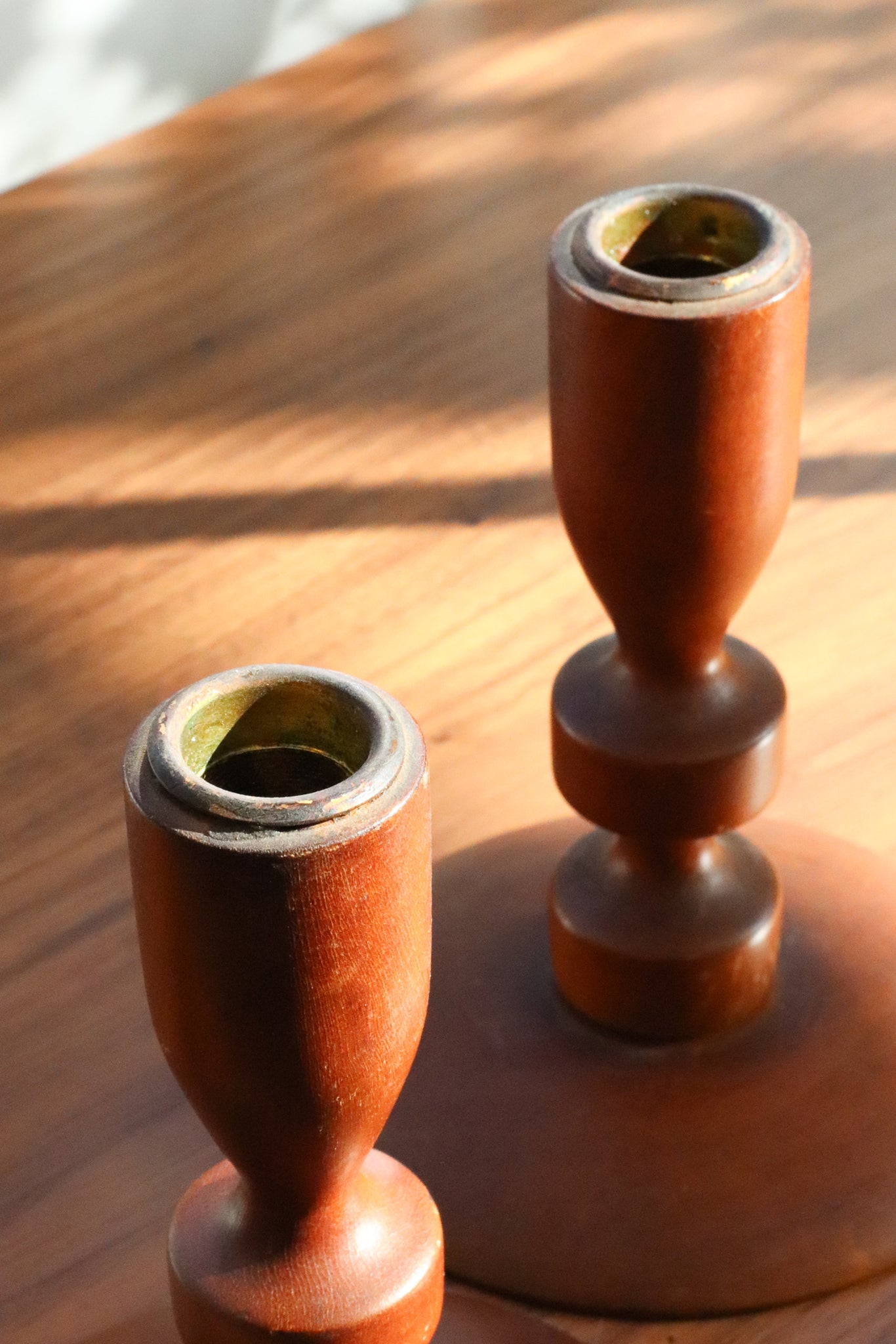 A pair of sculptural wood candlestick holders, in good vintage condition with light wear throughout.