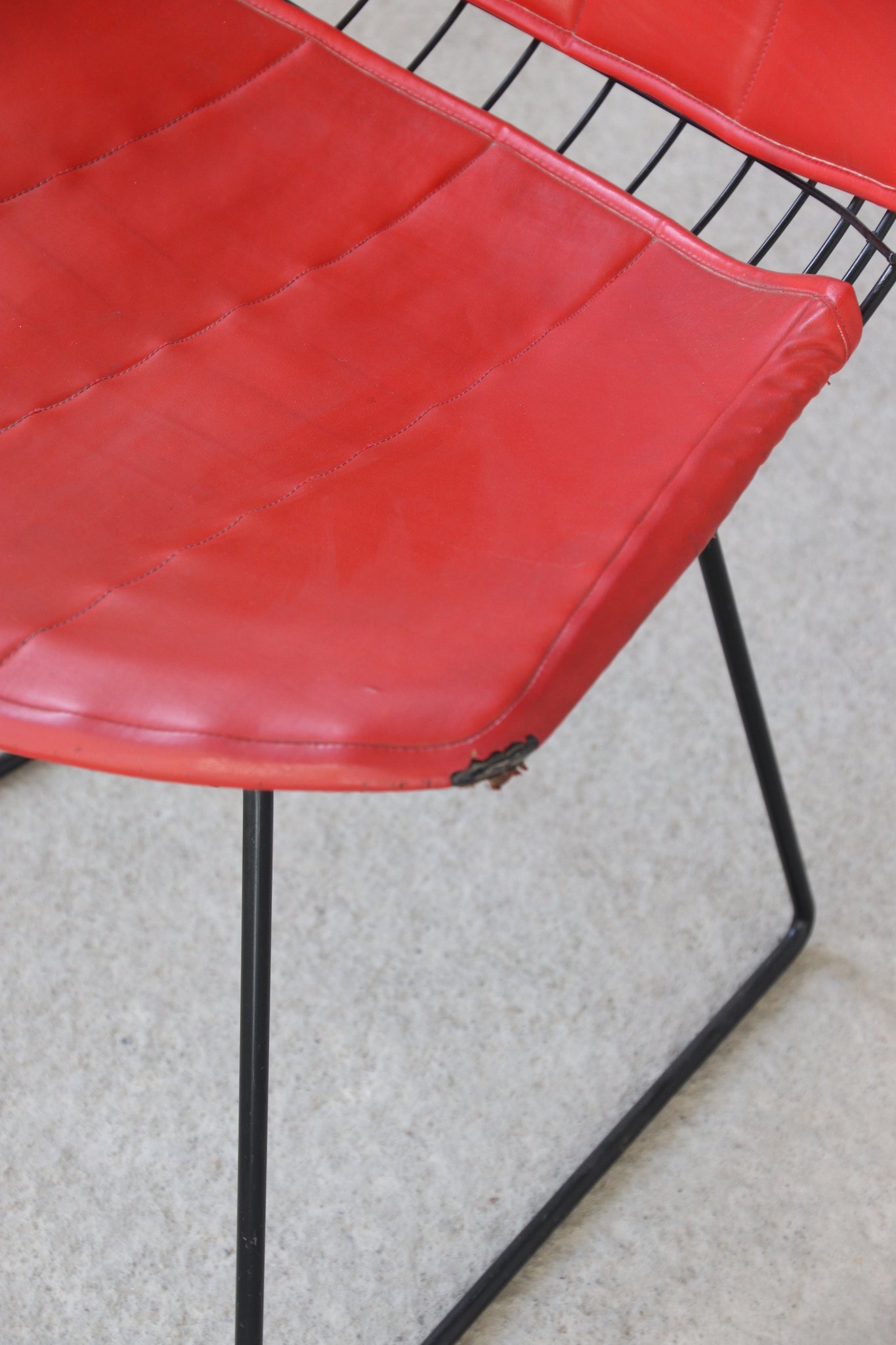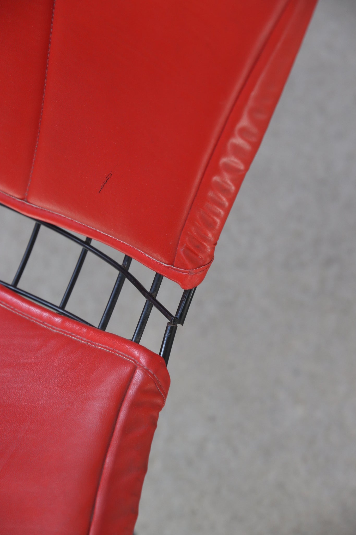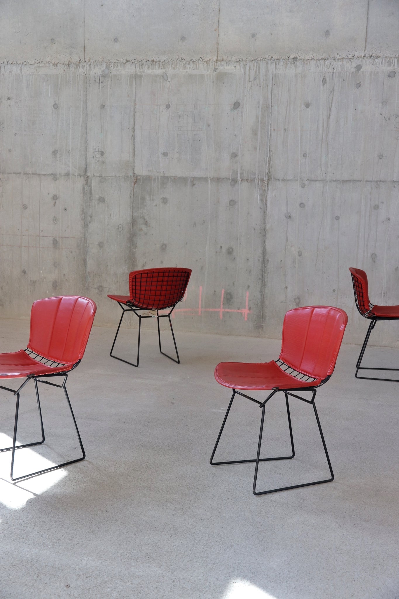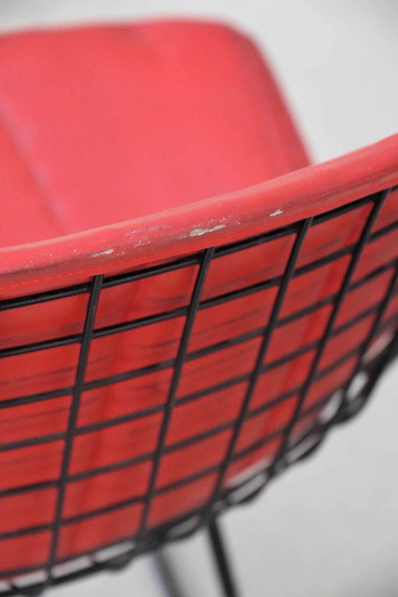 Set of 4 vintage black Bertoia chairs, designed by Harry Bertoia for Knoll. The black grid frame shows off a sculptural silhouette and is paired with an optional cherry red chair cover. In good vintage condition with significant surface wear throughout such as scuffs, scratches, patina, and chips in the black powder coat. Two chairs show minor breakage in the wire but do not affect form or function. Seat covers shows light creasing with scuffs, scratches, and patina throughout. See photos for reference. If you'd like additional details or photos you can email us to inquire.