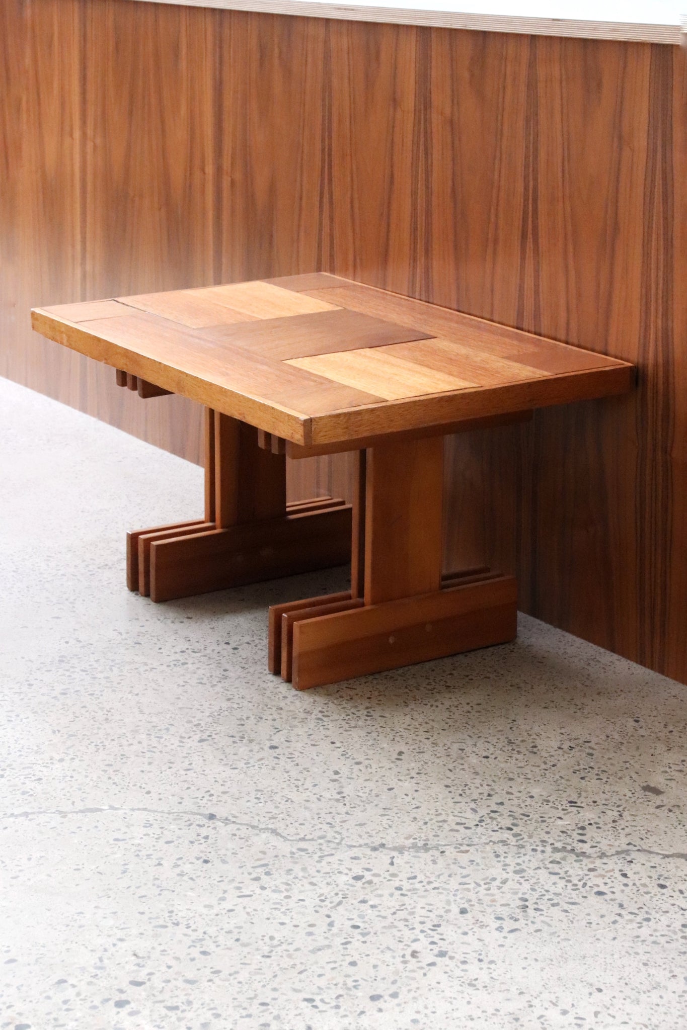 Small charming handmade wood table. Use it as a small coffee table or side table! Table features an inlaid geometric wood paneled top with chunky I-beam wood legs. Condition shows significant wear in between the inlaid pieces on the table top with cosmetic wear throughout. See last photos for reference. If you'd like additional details or photos you can email us to inquire.