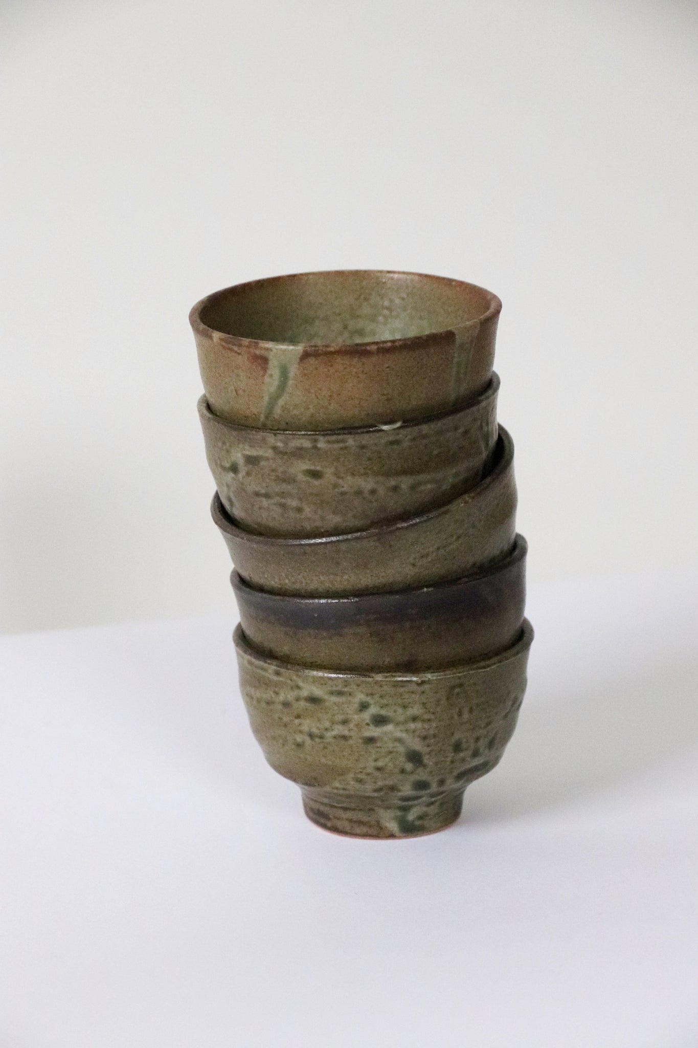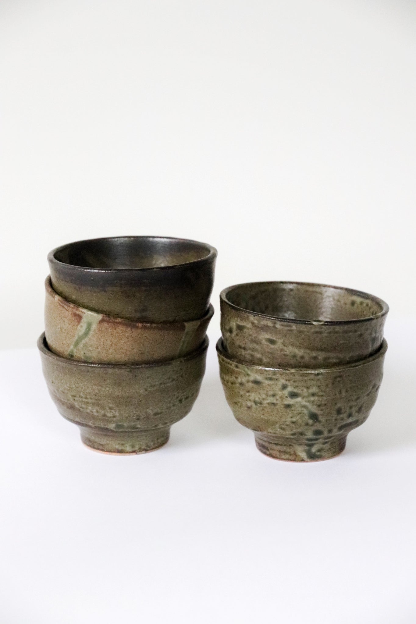 Set of five green glazed stoneware teacups. In excellent vintage condition.