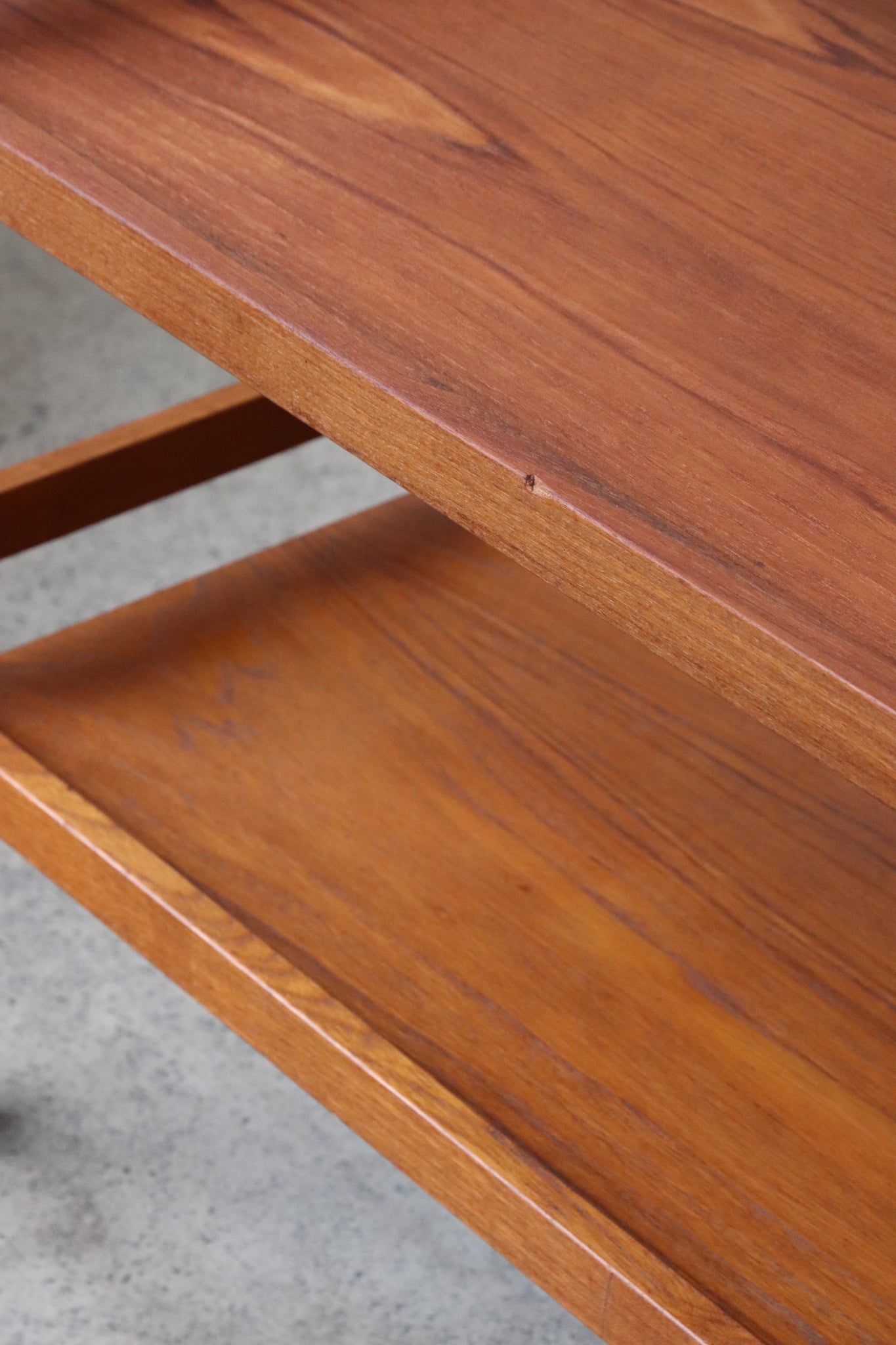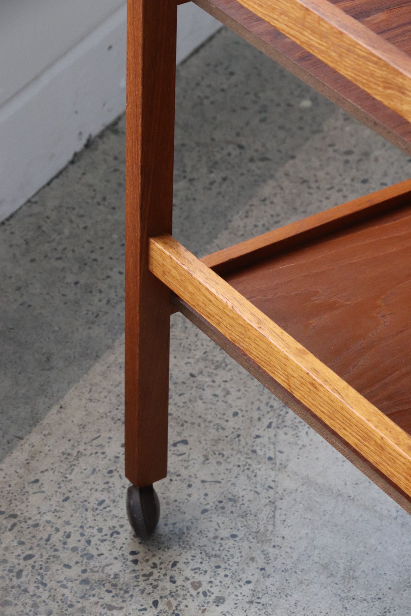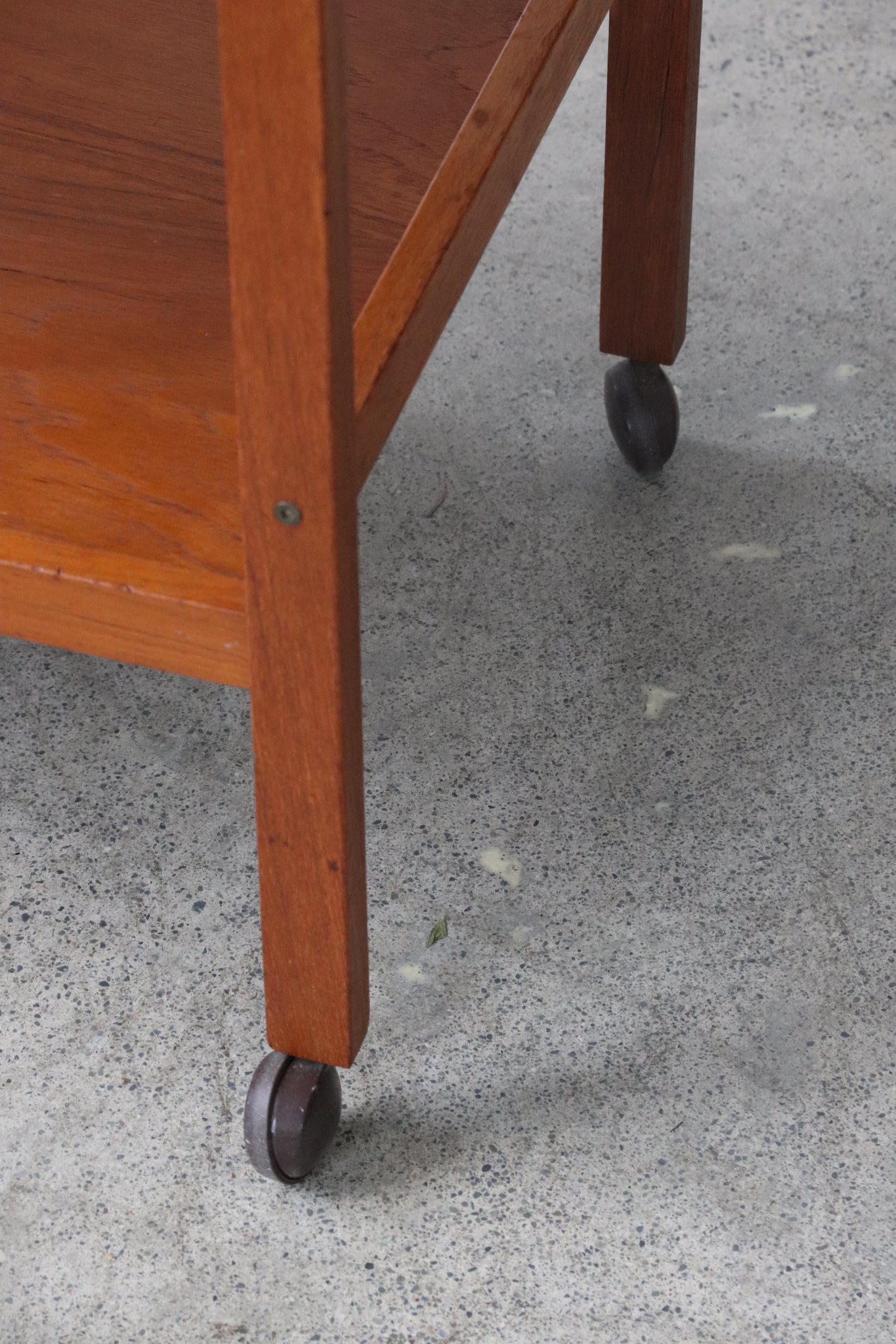 Mid century modern teak bar cart on casters. In good vintage condition with light wear such as minimal scratches, scuffs, and patina throughout. One significant dent on the wood rim of the top rail. See photos for reference. If you'd like additional details or photos you can email us to inquire. No manufacturing markings present.