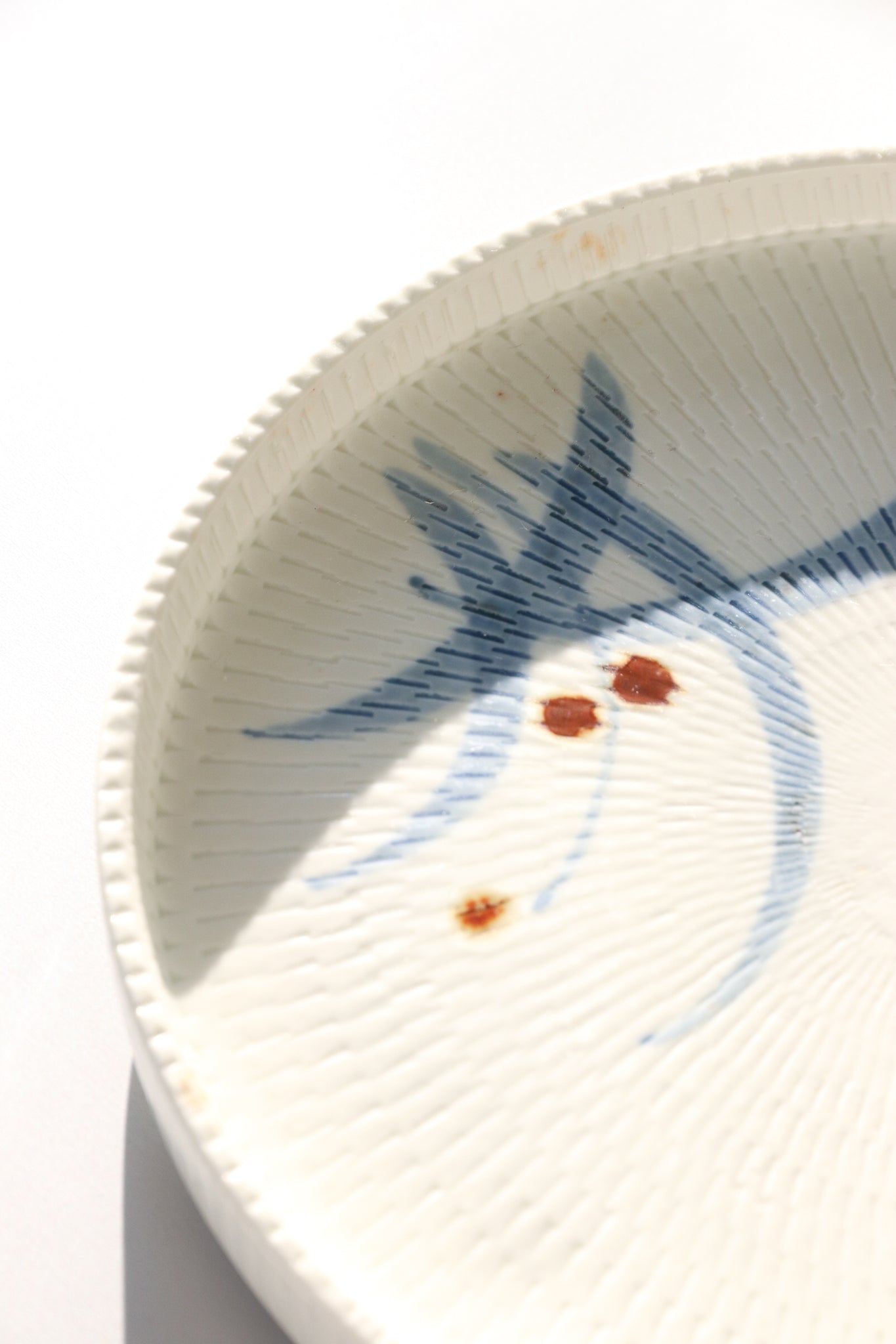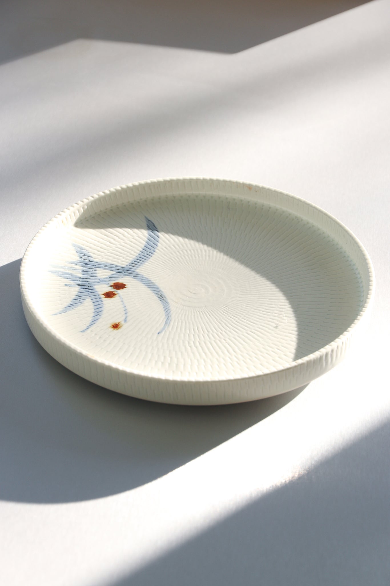 Round ceramic dish with a radiating texture pattern throughout an abstract plant motif glaze. In good vintage condition with light wear and patina throughout.