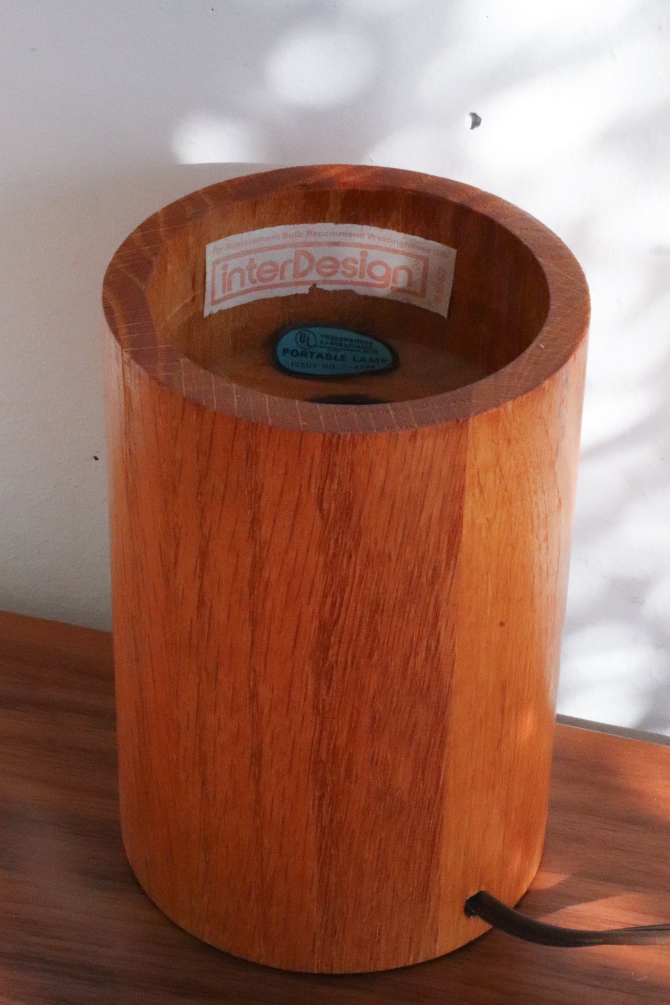 Globe table lamp with cylinder wood base by Interdesign. In good vintage condition with light wear and patina throughout. Lamp comes with a 40-watt G40 bulb. See photos for reference. If you'd like additional details or photos you can email us to inquire.