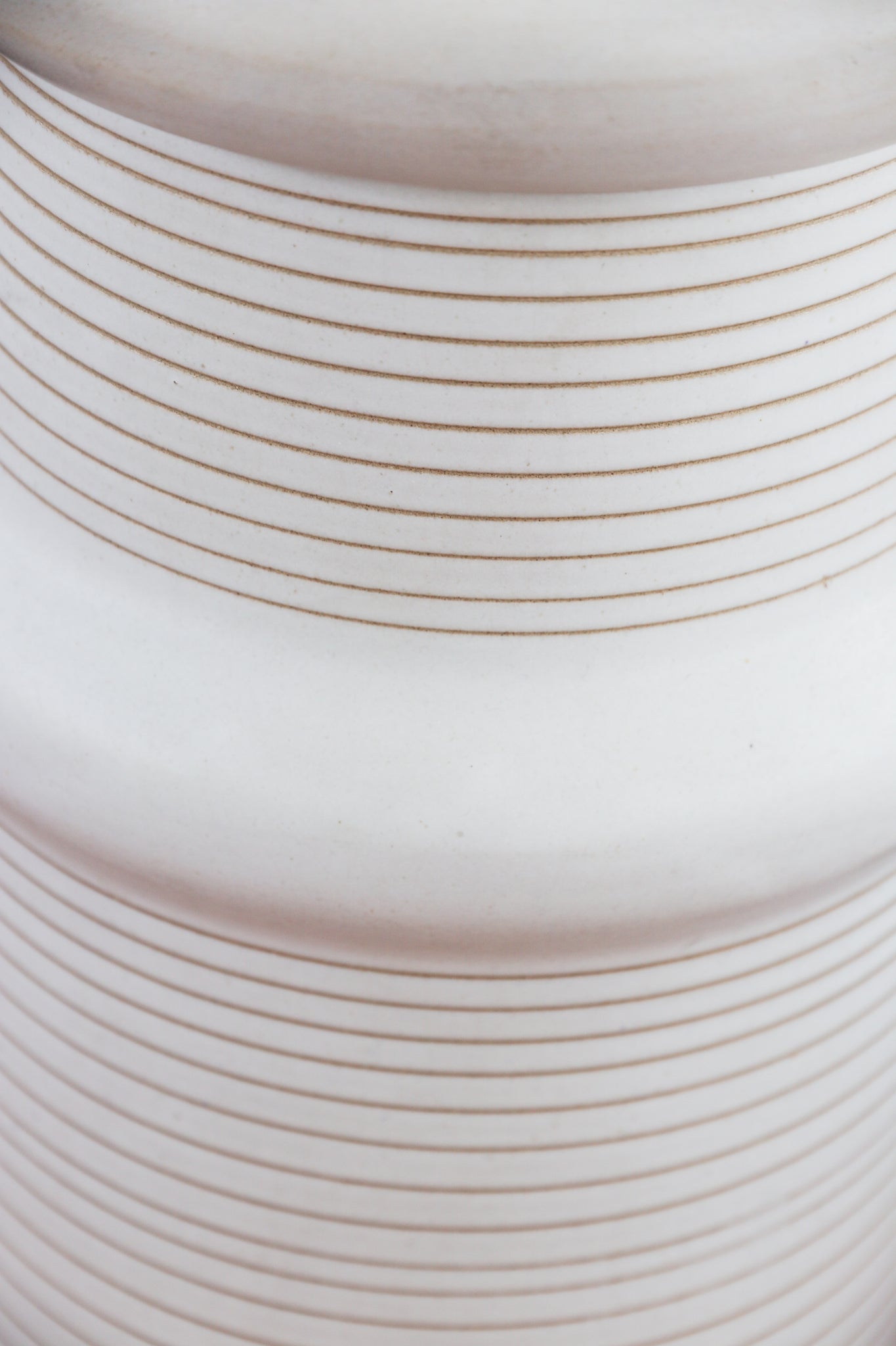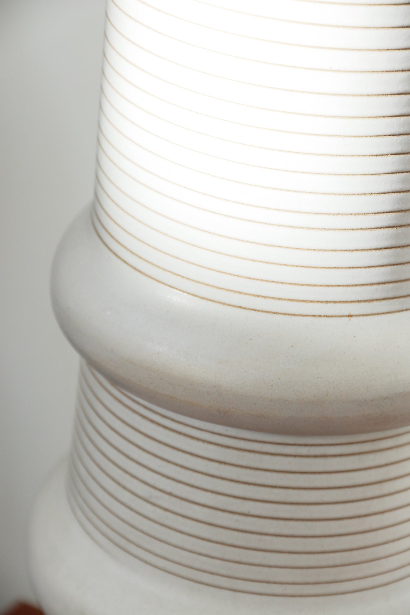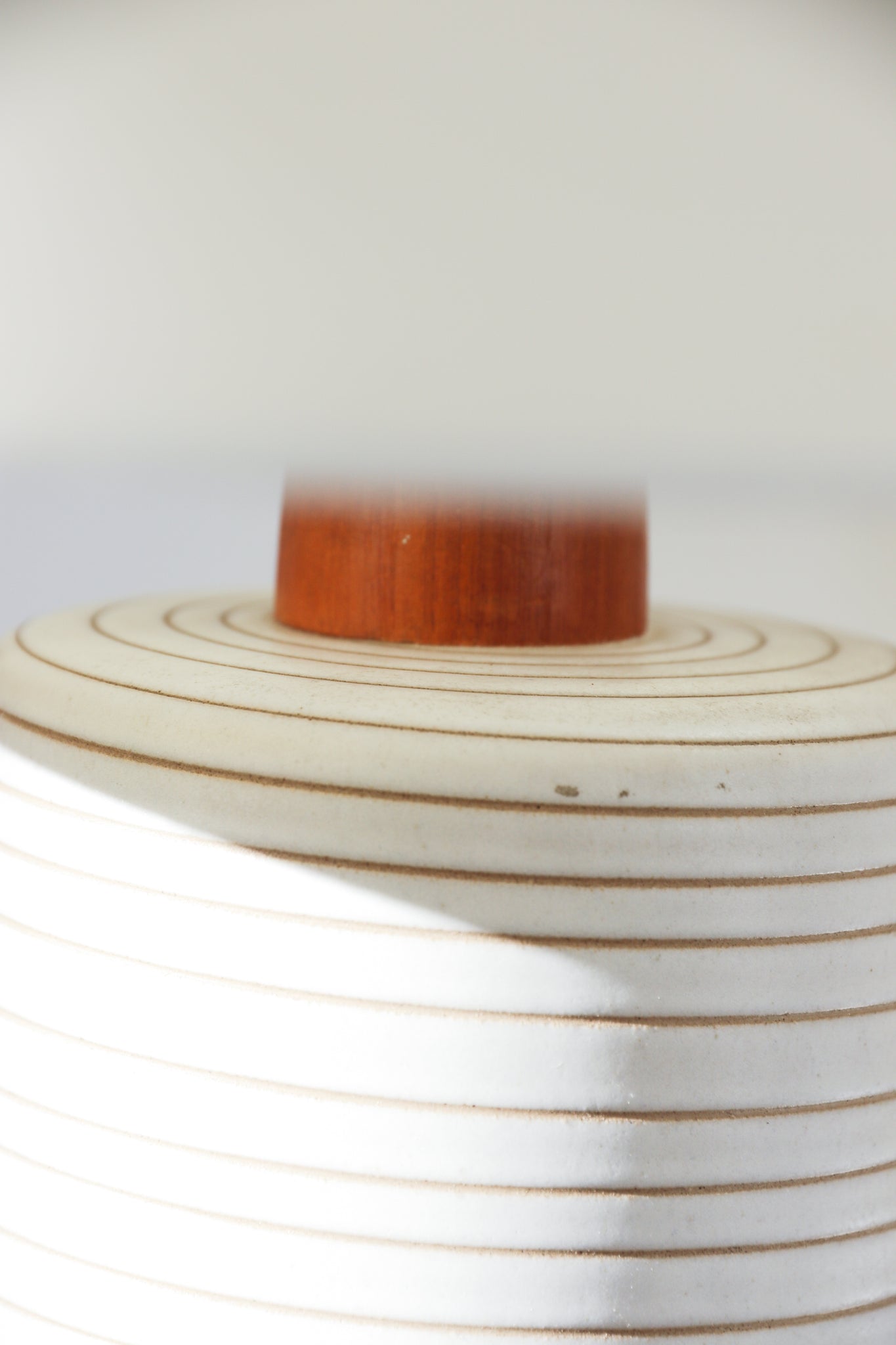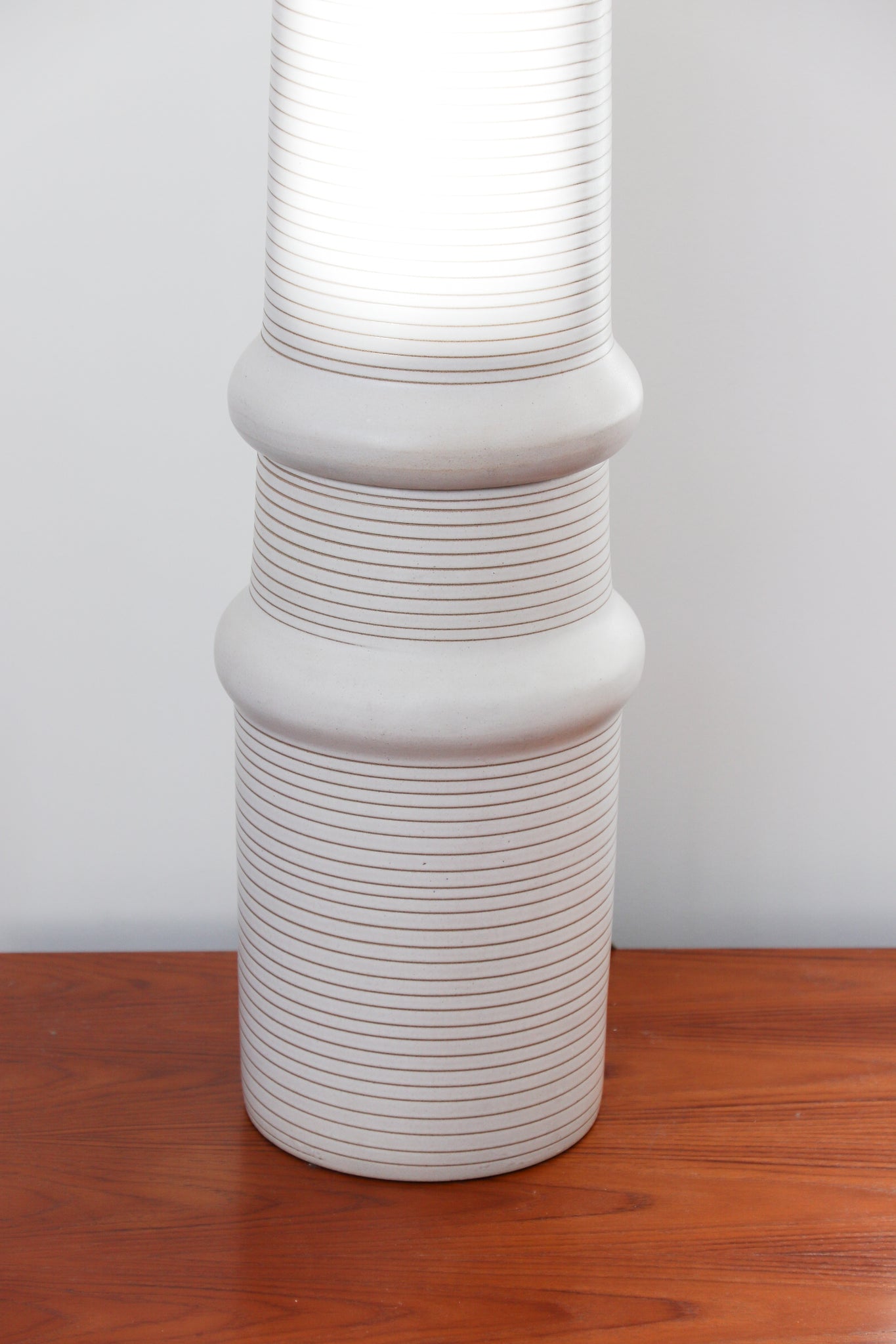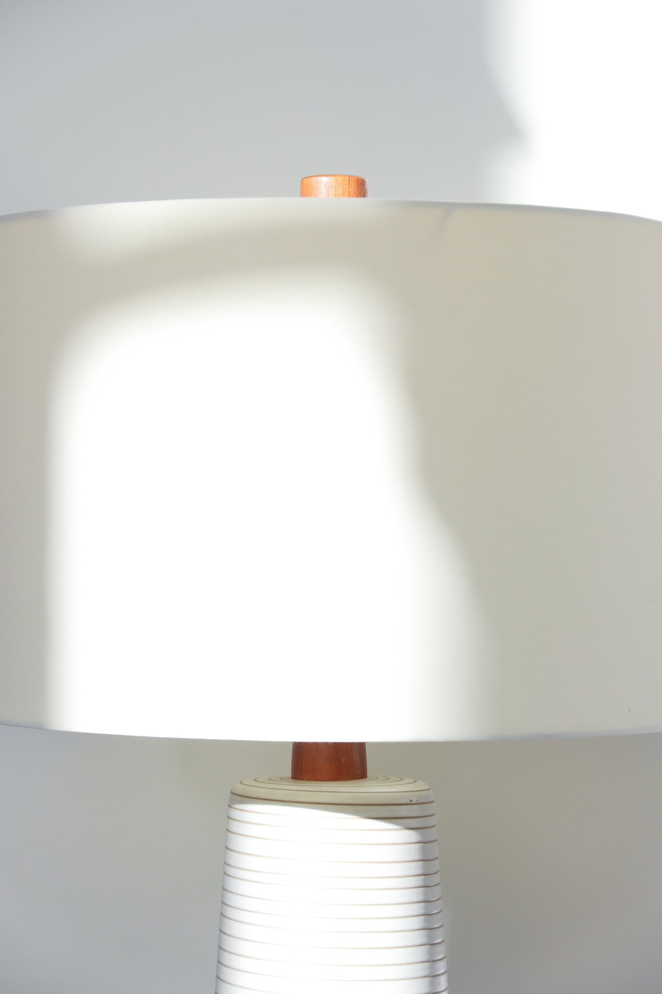 Mid Century ceramic & walnut table lamp by Gordon & Jane Martz for Marshall Studios. Lamp features a monumental silhouette with a textured ring/ line detailing around the ceramic base with walnut detailing in the neck and original finial. Paired with a drum cream shade. In very good vintage condition with some minor markings and patina throughout shade. See photos for details. No chips or cracks throughout base. If you'd like additional details or photos you can email us to inquire. Signed.